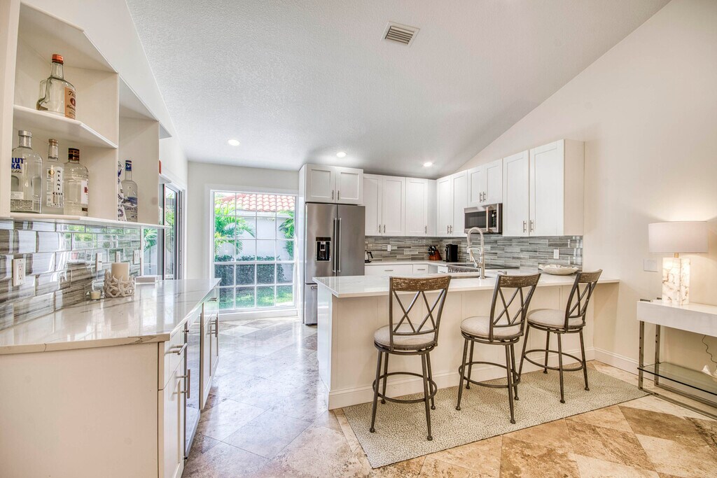 Elegantly updated home in the highly sought after gated community of Eagleton Lakes at PGA National. This impeccable home features a new kitchen and 3 new bathrooms! The home offers an open,floor plan with vaulted ceilings and abundant natural light. Upgrades include a brand-new kitchen with custom cabinetry,quartz countertops,stainless-steel appliances,wine cooler,renovated baths,new flooring,and freshly painted interior and exterior. The split-bedroom layout provides privacy,and the spacious primary suite features a lovely seating area and access to the screened patio overlooking a private backyard,perfect for quiet relaxation or entertaining. Located in prestigious PGA National,residents enjoy the security of a gated community. MLS ID B26013997