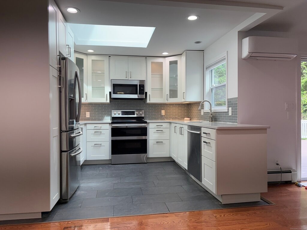 Call for Availability - This renovated smart home located in a central location of sought-after New Canaan offers an open kitchen layout with stainless steel appliances, bright living room with a charming fireplace, large dining area with a slide door to a large 600 sqft deck overlooking a large leveled backyard with a playground. Primary bedroom with a walk in closet and a full bathroom with a tub with massage jets and a steam shower with massage jets as well, 2 spacious bedrooms full of natural light, another full bath and extra bedroom that can be used as an office. Fully renovated basement can be used as a playroom or a media room. New roof with an active warranty, new floors and recessed lighting throughout, new well pump and a sump pump. This house also offers a smart HVAC system in every room working with Google and Alexa with Schedules and various features in addition to a baseboard heating system. New alarm system with full coverage throughout the house with the ability to alert you via mobile and email. Outdoor lights that connect to Google and Alexa with Scheduling and brightness ability. Beautiful yard comes with mature trees with plenty of flower beds, a vegetable garden, and fruit trees. Close to the major highways, YMCA, Waveny Park, Colhoun Preserve and more. MLS# 24112883
