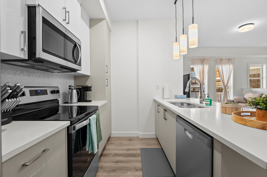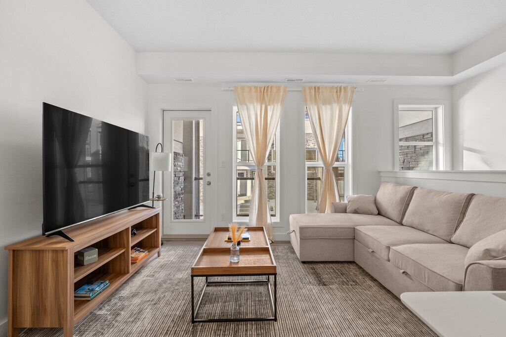Minutes away from Winsport Olympic Park, this private townhouse offers a cozy getaway for executives, couples, small gatherings of friends, or new families. Feel at home with a king-size bed, a queen sofa bed, and a 65" smart TV with Netflix. Enjoy the convenience of garage parking and a dedicated workspace, along with a fully equipped kitchen and a balcony with an outdoor dining set. The townhouse features a modern and inviting living room with a queen sofa bed, a 65" smart TV with Netflix, and access to a balcony with a dining set. The kitchen is equipped with stainless steel and custom appliances, including a 4-burner stove, oven, microwave, refrigerator, freezer, and dishwasher. Complimentary Keurig pods, tea, and Brita are provided. The dining area includes a large table with island seating and bar stools. The property includes garage parking, street parking, and visitor parking. Additional parking can be found via street parking or visitor parking. Essential supplies are provided to help you settle in comfortably upon arrival, with additional replenishments available at an extra cost. A PO box can be set up prior to your arrival upon inquiry, with fees applying. Located in the transit-friendly Aspen Spring area, the townhouse offers convenient access to Calgary Transit bus routes and major roads, making it easy to reach downtown Calgary and other key destinations. The neighborhood is designed for a walkable lifestyle, with a picturesque recreational area and abundant walking trails. Nearby attractions include Aspen Landing Shopping Centre, Westside Recreation Centre, Griffith Woods Park, and WinSport Canada Olympic Park. The property has a strict no-smoking policy, with a $250 CAD fine for violations. No parties, drugs, excessive drinking, or loud music are allowed. Quiet hours are from 10 pm to 7 am, and a noise detector is in place to ensure compliance. Unauthorized late check-out will result in an extra night stay or additional fees. Guests are responsible for any damage to linens, towels, utilities, or equipment upon check-out, with fees claimed through the booking platform. The use of the mailbox is not included with the property, and a PO box can be arranged for a fee. Children must be supervised on the balcony, and no shoes are allowed inside the home. The townhouse includes a dedicated workspace with fast Wi-Fi at 250mbps, making it remote work-friendly. The office and den area provide a comfortable environment for working from home.