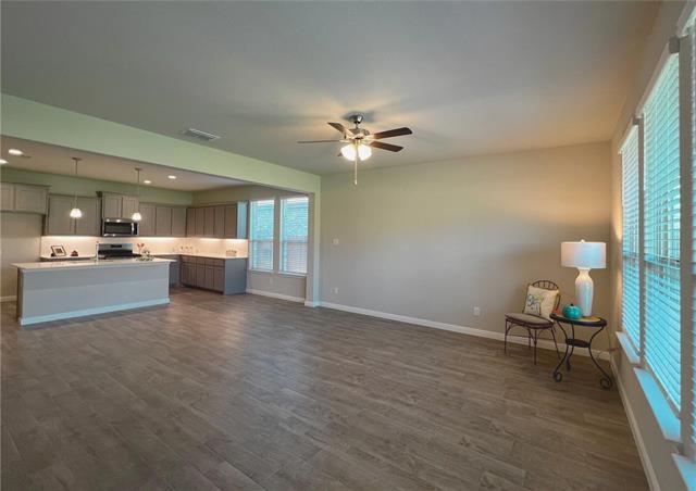 Beautiful home located directly across from the community lake in a highly desirable master-planned community featuring parks and a pool. Ideally situated approximately 0.3 miles from the elementary school, allowing for easy walking access. This home offers an open-concept layout filled with natural light, creating a bright and inviting atmosphere. It also features a versatile flex room that can function as a fourth bedroom, home office, gym, or playroom. The kitchen is equipped with quartz countertops, a tile backsplash, a gas range, and stainless steel appliances. The spacious primary bedroom includes dual sinks and a separate shower, while generously sized secondary bedrooms provide comfortable living space. Additional features include a large living area with high ceilings, a full-size laundry room, and a walk-in pantry for added convenience. Enjoy outdoor living with a fenced backyard, covered patio, and a two-car garage. The oversized backyard, combined with increased distance from rear neighbors, provides enhanced privacy and ample space for outdoor activities. Positioned directly in front of a park, pond, and fountain, the home offers beautiful views and a serene environment. With no front-facing neighbors, you’ll enjoy exceptional privacy, open views, and a quiet setting. Zoned to Northwest ISD and conveniently located near major highways, schools, and shopping centers. Community amenities include a resort-style pool with a lazy river, playground, jogging paths, and walking trails. A rare opportunity to lease a home in such a prime location—schedule your showing today!