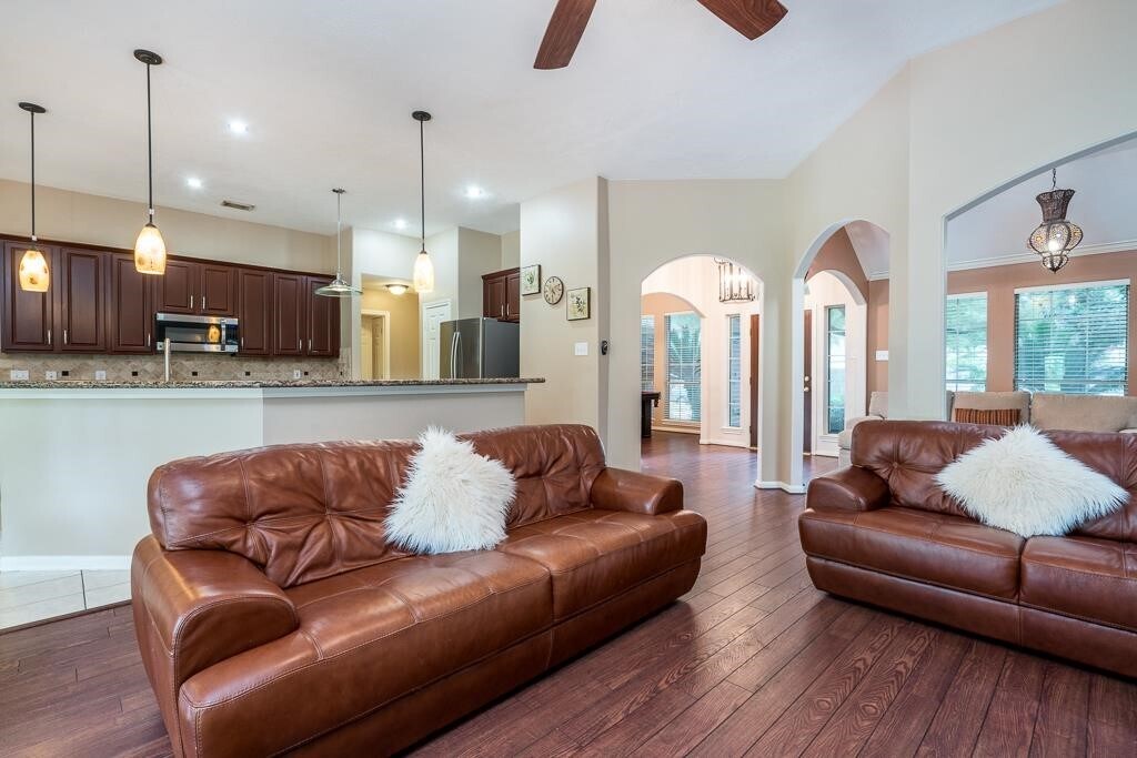 Well maintained 1-story home in Aberdeen Trails. Home features wood floors in formal dining,living & family room,gourmet island kitchen w/granite counters,stainless steel appliances,pendant lights & 42'' cabinets.This open floor plan is perfect for entertaining.Large master suite & master bathroom has his/her sinks,Jacuzzi tub & large shower w/3 shower heads,rainfall,2 seats & 2 built-in shelves.Good size backyard & covered patio.No Back Neighbors.Walking distance to pool,park & tennis courts. MLS# 19812550