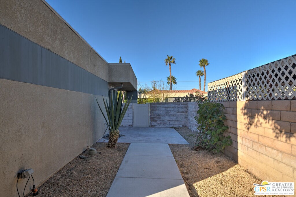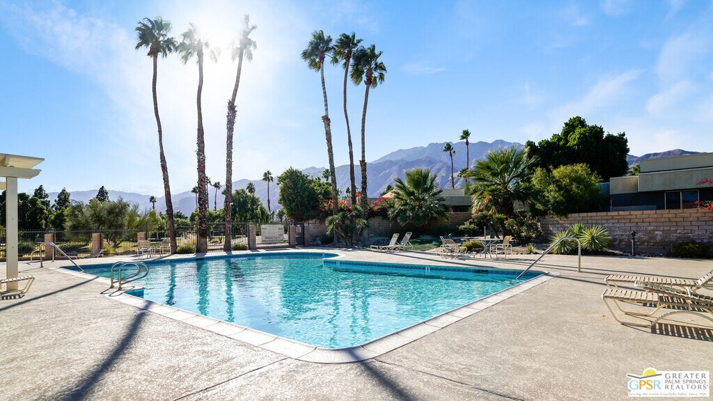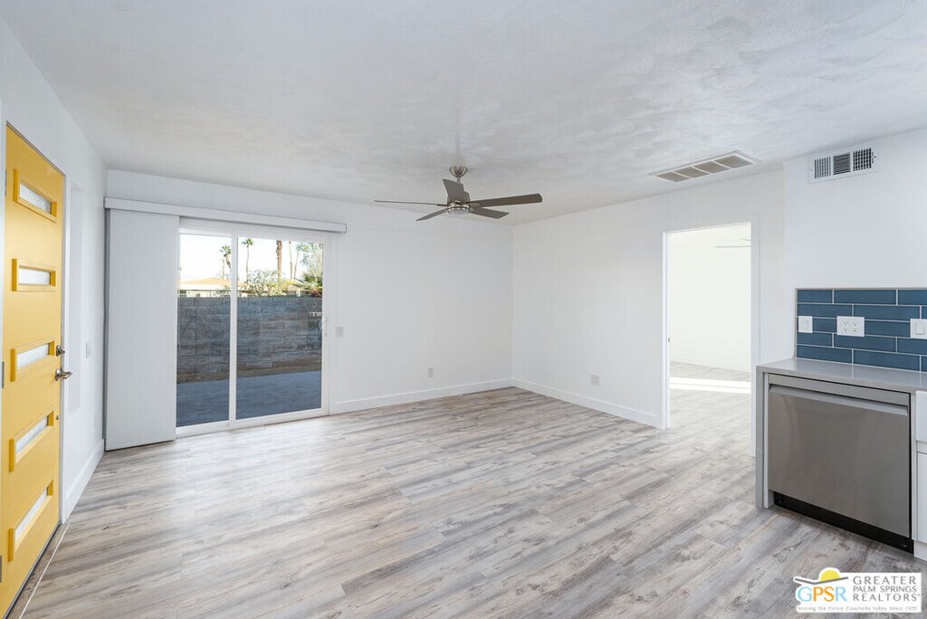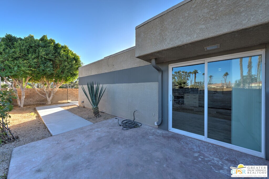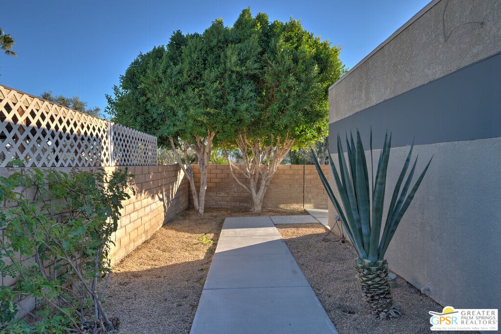 CONDO + PRIVATE YARD + GARAGE for Long-term lease. Be the first to live in this newly renovated one bedroom and one bathroom condo with a private yard and private attached garage is a true Palm Springs gem. Just minutes from downtown Palm Springs, this community is a PERFECT place to be. Completely renovated, this condo balances modern style with the beauty of the California desert. Utilizing the desert color palette, the high quality features are underscored by the ubiquitous flooring throughout and framed by the white walls and ceiling in this OPEN FLOOR PLAN home. In the kitchen, large aggregate quartz counters compliment the spacious wall-length cabinetry, tile backsplash and built-in appliances. The bedroom includes a newly renovated bathroom with matching blue tiles and modern fixtures. Advance outdoors via the sliding doors in the living room or master bedroom to a wrap-around back/side yard with drought-tolerant landscaping and beautiful shade tree in the corner. The yard is perfect for entertaining or enjoying time with your furry best friend. An interior laundry room includes a stacked washer/dryer. The attached one-car garage includes a tankless water heater. The pool and spa are a few homes away. The community includes gated access, eight (8) pools/spas, tennis/pickle ball and basketball courts, and a large central park private for only community residents. Pets ok. Water, trash and landscaping included in rent. MLS# 25577485PS