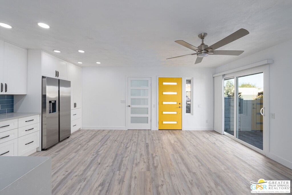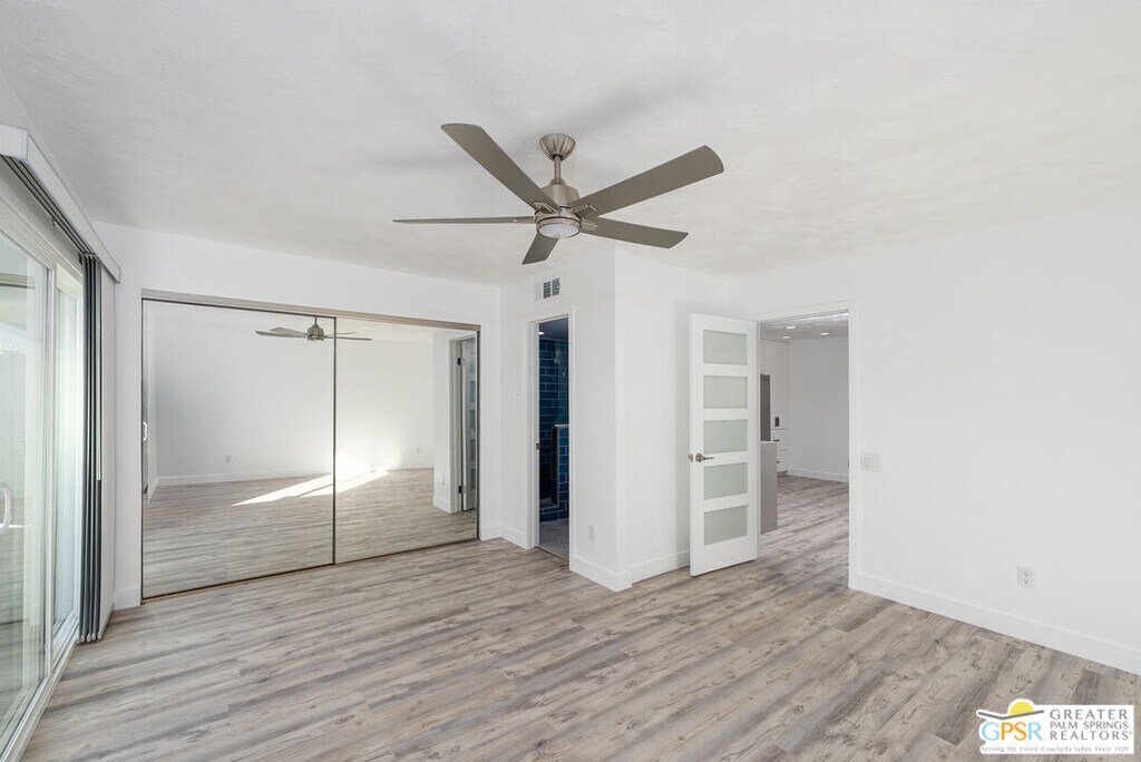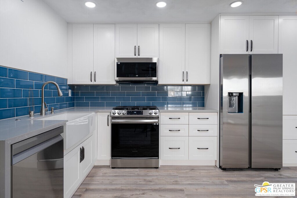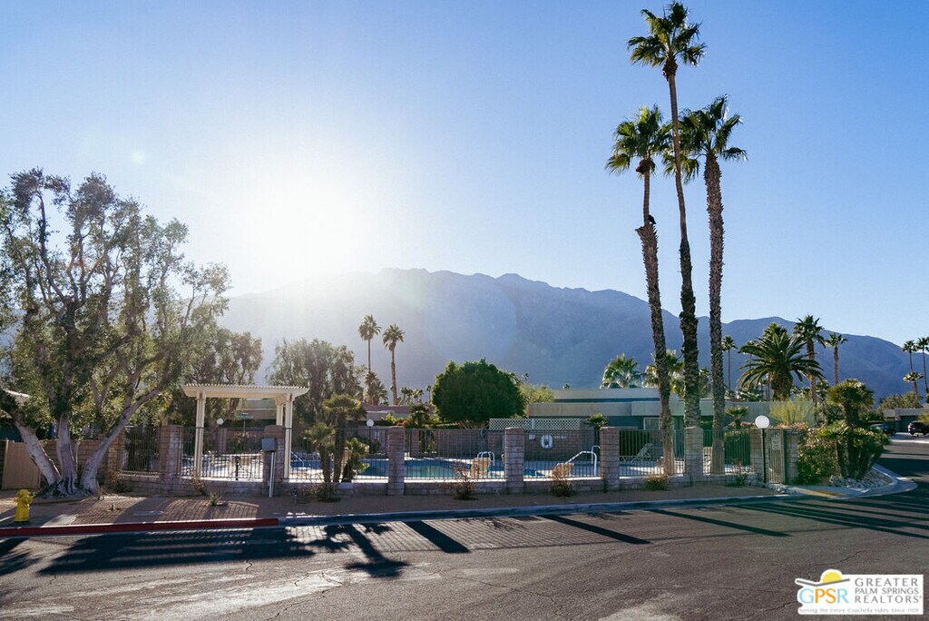 CONDO + PRIVATE YARD + GARAGE for Long-term lease. Be the first to live in this newly renovated one bedroom and one bathroom condo with a private yard and private attached garage is a true Palm Springs gem. Just minutes from downtown Palm Springs, this community is a PERFECT place to be. Completely renovated, this condo balances modern style with the beauty of the California desert. Utilizing the desert color palette, the high quality features are underscored by the ubiquitous flooring throughout and framed by the white walls and ceiling in this OPEN FLOOR PLAN home. In the kitchen, large aggregate quartz counters compliment the spacious wall-length cabinetry, tile backsplash and built-in appliances. The bedroom includes a newly renovated bathroom with matching blue tiles and modern fixtures. Advance outdoors via the sliding doors in the living room or master bedroom to a wrap-around back/side yard with drought-tolerant landscaping and beautiful shade tree in the corner. The yard is perfect for entertaining or enjoying time with your furry best friend. An interior laundry room includes a stacked washer/dryer. The attached one-car garage includes a tankless water heater. The pool and spa are a few homes away. The community includes gated access, eight (8) pools/spas, tennis/pickle ball and basketball courts, and a large central park private for only community residents. Pets ok. Water, trash and landscaping included in rent. MLS# 25577485PS