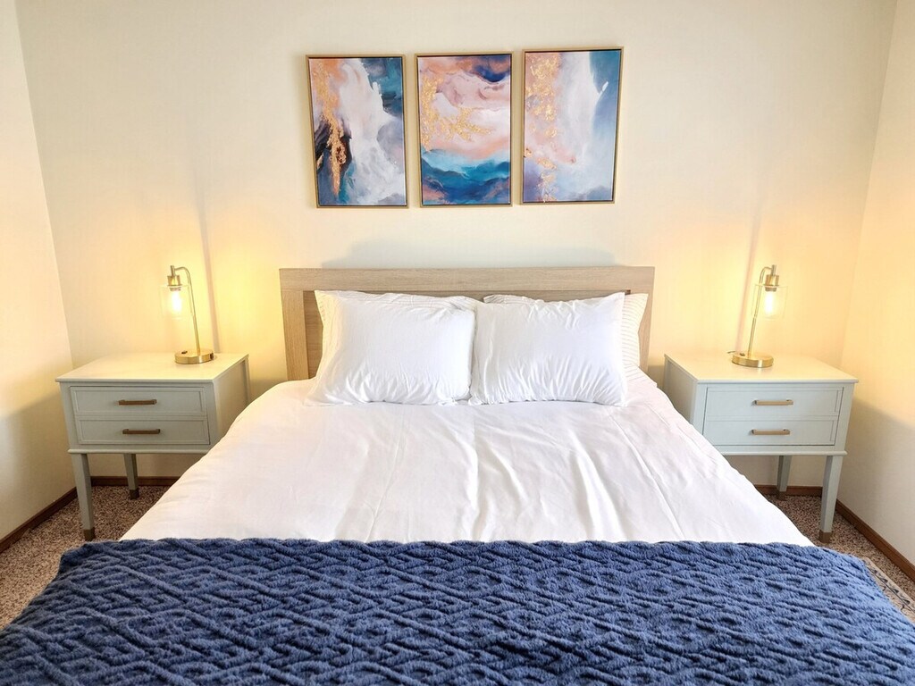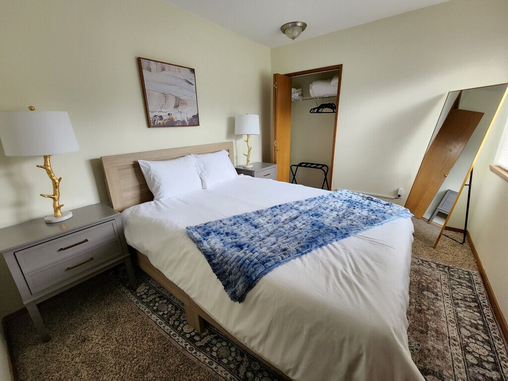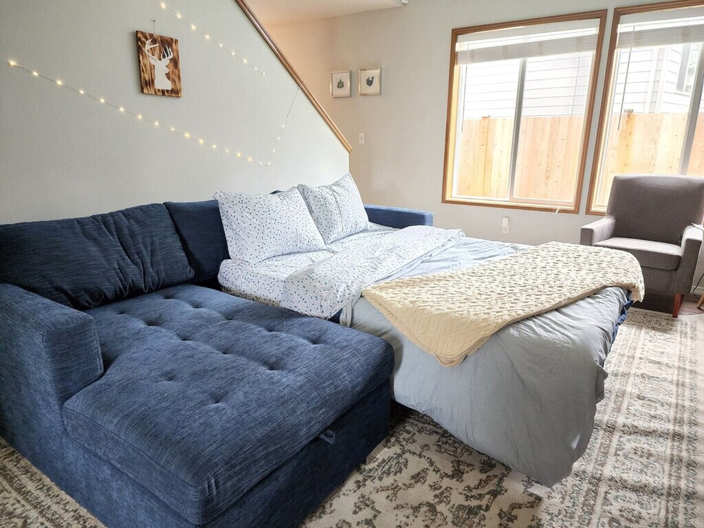 Feel at home in this stylish and comfortable townhouse featuring modern furniture. The master bedroom boasts a king-size bed with a private full bath, while two additional queen bedrooms and a sleeper sofa provide ample sleeping arrangements. Enjoy entertainment on the 65" smart TV in the living room or on individual TVs in each bedroom. Portable AC units ensure comfort throughout the home. Located just 3 miles from Alderwood Mall and a short drive to Mukilteo and Edmonds waterfronts and ferries, this property offers both convenience and leisure. This spacious townhouse is furnished with brand new pieces and offers a fully equipped kitchen complete with a Keurig, blender, mixer, and other appliances. The dining room comfortably seats six, with additional seating at the counter. A guest bathroom is conveniently located between the kitchen and living room on the ground level. Guests have access to the entire 'A' unit of this two-unit townhouse, including a fully fenced backyard and dedicated parking for two cars. The property includes dedicated parking for two cars and a fully fenced backyard, providing both convenience and privacy. Situated in a prime location, this townhouse is just 3 miles from Alderwood Mall, home to 157 stores including Daiso's first US store. A quick 10-minute drive will take you to the Mukilteo and Edmonds waterfronts and ferries, offering easy access to local attractions and scenic views. This is not a party house. Quiet hours are enforced after 9pm and before 8am. Smoking is prohibited, with a $150 smoke remediation fee if evidence is found. Parties will result in immediate cancellation of the reservation and a $300 penalty fee. Pets are not allowed, and a $150 cleaning fee plus penalty applies if pet hair is found. The electronic lock on the front door automatically locks after 4 minutes, so be cautious not to lock yourself out. A basic first aid kit and fire extinguisher are available in the unit. [SI]