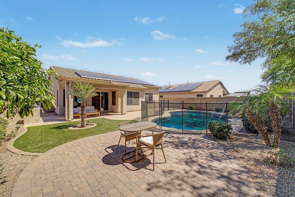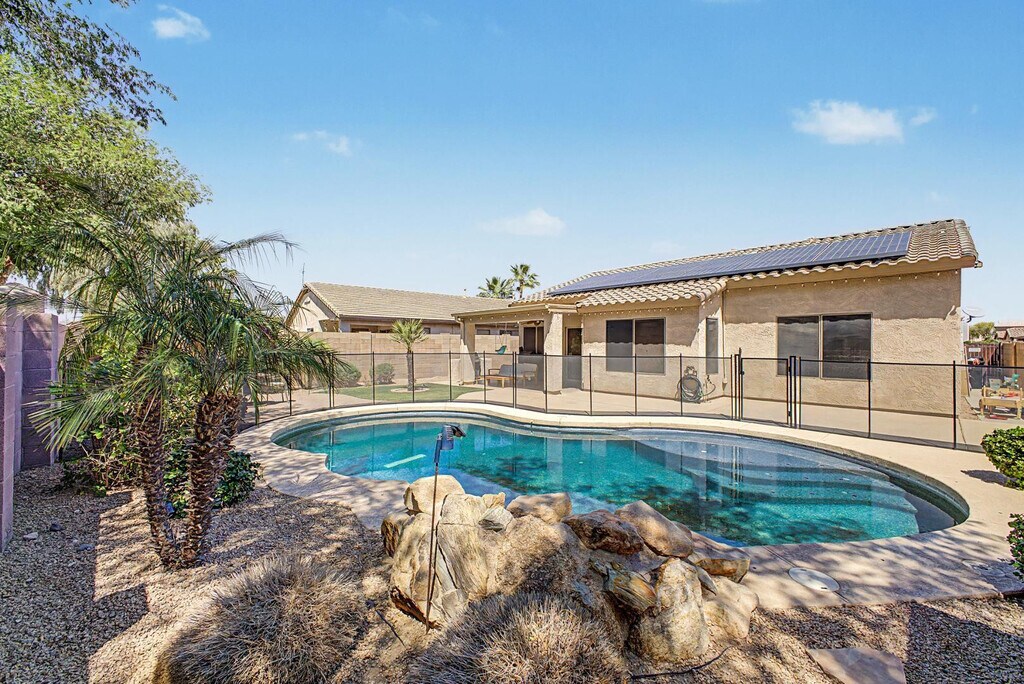 Come enjoy this beautifully updated 3-bedroom home featuring a true tropical paradise backyard! Relax or entertain in the private oasis complete with a saltwater pool (weekly pool service included),pavers,synthetic grass,and a built-in BBQ. Inside,the home showcases wood-look luxury vinyl plank flooring throughout,fresh interior paint,and newer stainless steel appliances. The washer,dryer,and refrigerator are all included for your convenience. Solar is also included,helping keep APS bills significantly lower for tenants. Additional features include a Ring doorbell camera and security system. This home offers comfort,style,and efficiency all in one!