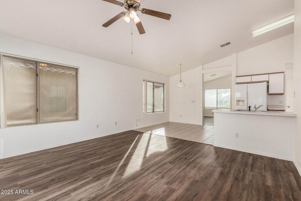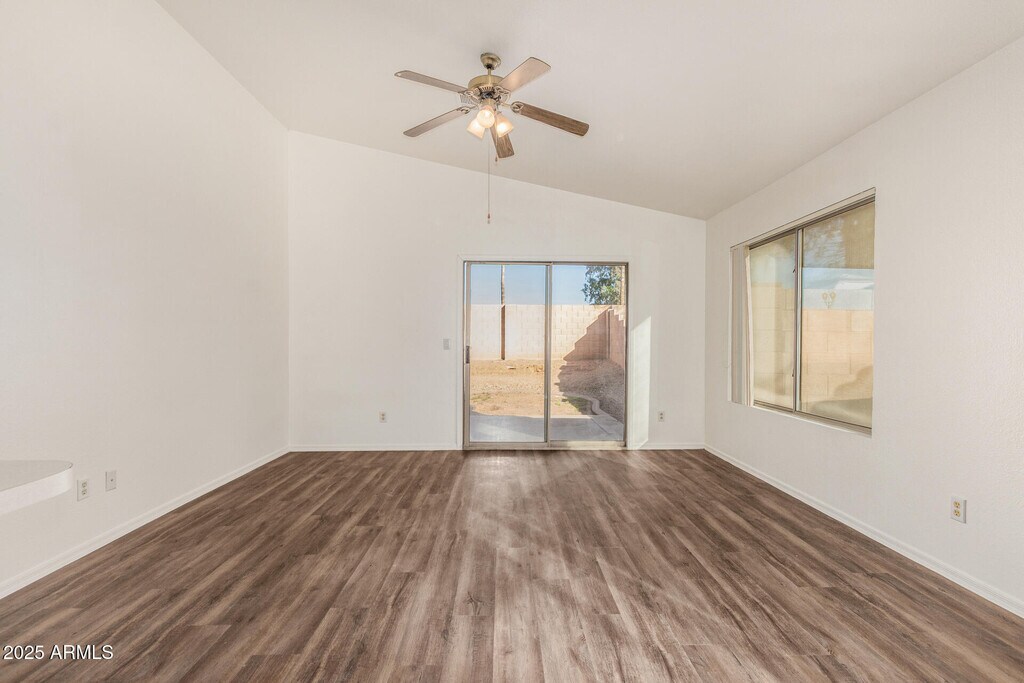 Welcome to this inviting 3-bedroom,2-bath home located in the desirable Mountain Vista subdivision. The thoughtfully designed open floor plan features vaulted ceilings and an abundance of natural light,creating a bright and airy atmosphere throughout. A separate formal living room offers flexible space for entertaining or relaxing. The kitchen seamlessly opens to the dining area and family room,making it ideal for everyday living and gatherings. All carpet has been replaced with luxury vinyl plank flooring,providing a modern look and easy maintenance. The primary suite includes a full en-suite bathroom and a spacious walk-in closet. Step outside to enjoy a private,quiet backyard,perfect for unwinding at the end of the day. Conveniently located near shopping,dining,Luke Air Force Base,and Loop 303,this home offers both comfort and accessibility.