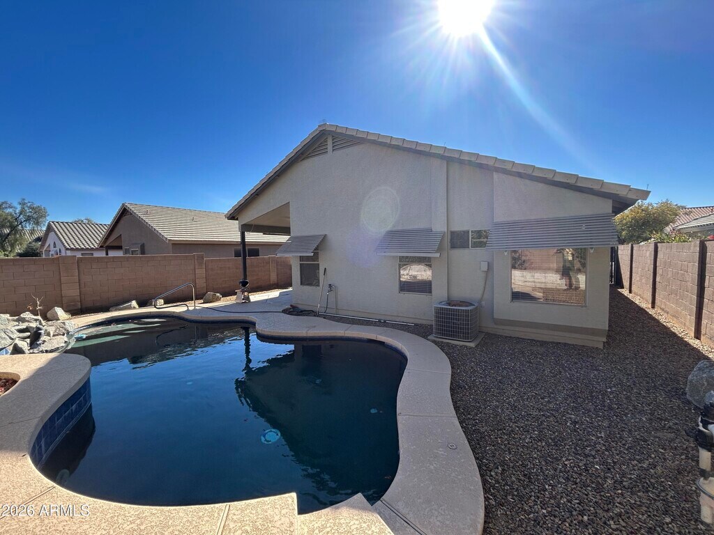 This beautiful three bedroom,two bathroom home with a private pool is located in the highly sought-after Canyon Trails neighborhood and is ready for immediate move-in. Designed with a spacious great room concept,the home features wood and tile flooring throughout,creating a clean and cohesive feel. The kitchen is equipped with stainless steel appliances,oak cabinets,and includes a refrigerator,making it both functional and inviting. The split floor plan offers added privacy,with a generous primary suite that includes a walk-in closet and a well-appointed bathroom featuring dual sinks,a walk-in shower,and a separate soaking tub. Additional highlights include 2-inch wood blinds,ceiling fans,and a washer and dryer included for convenience. Step outside to enjoy the Pebble Tec pool,perfectly positioned with desirable north/south exposure. This home combines comfort,style,and location,making it an excellent rental opportunity in a high-demand area.