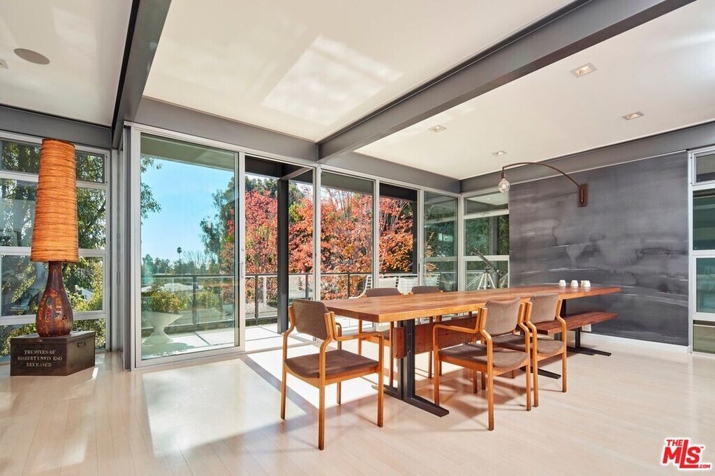 Situated on Alcima Avenue in Pacific Palisades, this tucked-back property exemplifies modernist design. Known as the Abidi House," the residence exudes privacy and remains intact after the recent fires. Originally designed by acclaimed architect James Tyler (FAIA), former principal architect for Craig Ellwood, the home has been thoughtfully updated for contemporary living. Embracing its natural surroundings, the property features floor-to-ceiling windows in true mid-century tradition. The entry level opens with an expansive foyer framed by windows, leading to a great room that seamlessly combines living and dining areas, all oriented toward views of the backyard and pool. A covered outdoor dining terrace extends the living space, while two ensuite bedrooms and a gourmet eat-in kitchen complete this floor. The lower level offers the home's private quarters, including a serene primary suite, two additional bedrooms with a shared bath, and a flexible media room or indoor gym. Each generously sized room is thoughtfully designed to capture verdant outlooks and maintain a strong connection to the lush backyard. Outside, the centerpiece is a sparkling pool with a built-in spa, contributing to the property's calm, retreat-like atmosphere. Owners have completed all necessary remediation work resulting from the fires and will provide documentation to confirm." MLS# 25585893