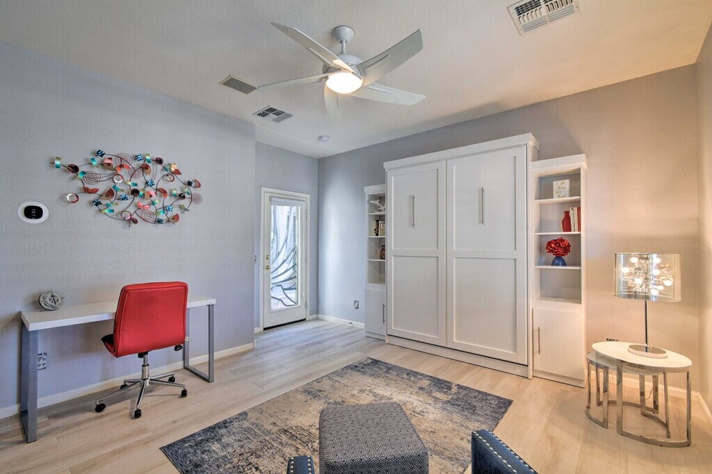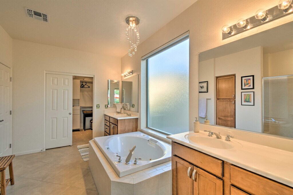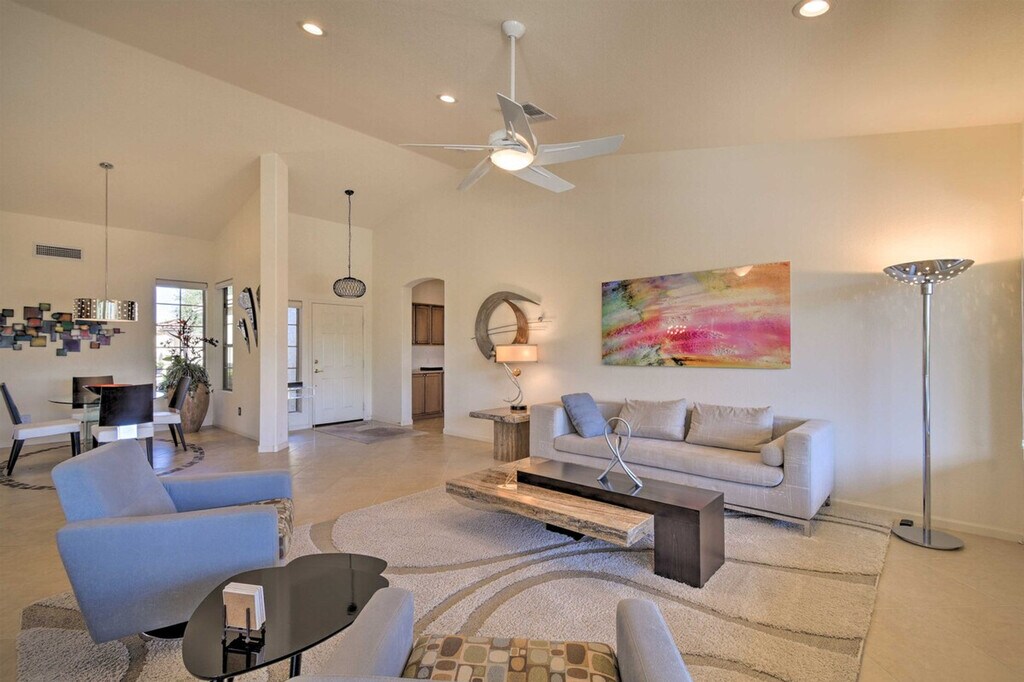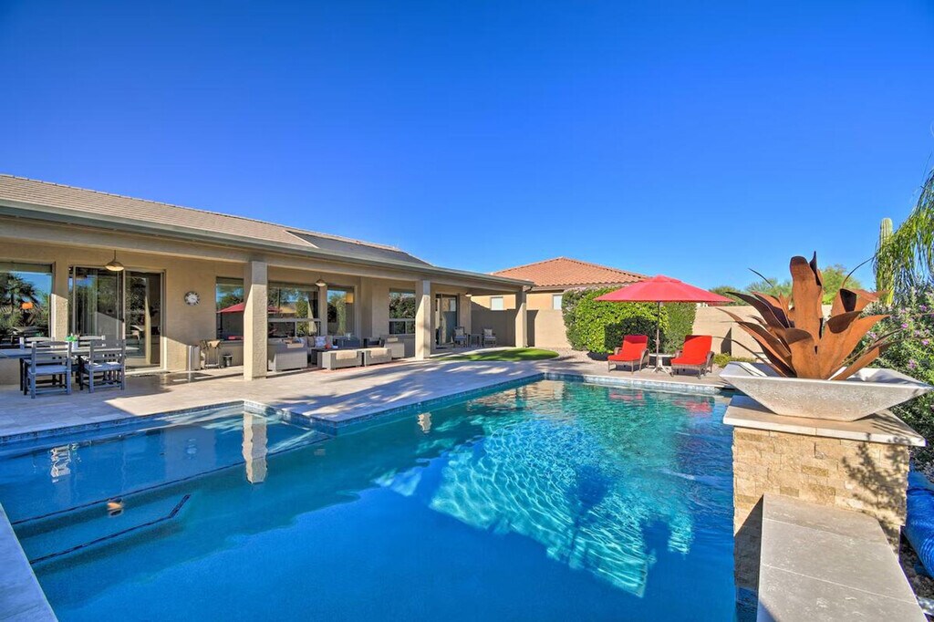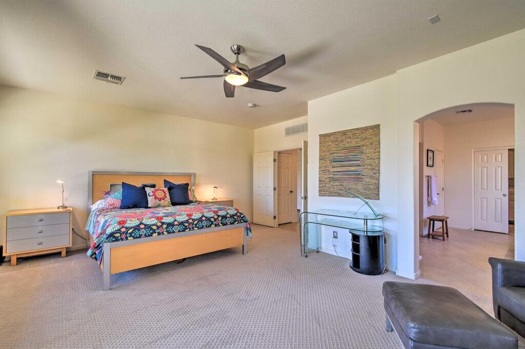 Experience the joys of the Sonoran Desert and feel at home in this stunning 2-bedroom, 3-bath vacation rental nestled in the 55+ PebbleCreek resort community! This high-end residence offers a tastefully furnished interior with a dining room, casita, golf cart, and a full kitchen. Enjoy a private fenced-in yard, a covered patio with a gas grill, patio furniture, an outdoor dining area, artificial grass, lush foliage, and a newly installed pool with a waterfall. Inside, you'll find tile and carpet flooring, tall ceilings, natural light, a family room, a living room with an entertainment center, ceiling fans, flat-screen cable TVs, a dining room, and a laundry room with a washer/dryer. The fully equipped kitchen includes cooking basics, a drip and Keurig coffee maker, and spices. A golf cart is available for use. When you're not enjoying the community gym and tennis courts of PebbleCreek, explore White Tank Mountain, enjoy the high-end shops nearby, or head downtown to enjoy Phoenix! This property is located in a 55+ adults-only community. Adults with children are allowed, but they are limited in the number of community amenities they can use. Events, parties, or large gatherings are not allowed. Guests must be at least 55 years old to book. By booking this property, you agree to comply with City of Goodyear Code of Ordinances Article 8-2 (the “Goodyear Ordinance”). Pursuant to the Goodyear Ordinance, this property requires a sex offender background check and you agree to provide any additional information required to confirm your eligibility to make this booking. [SI]