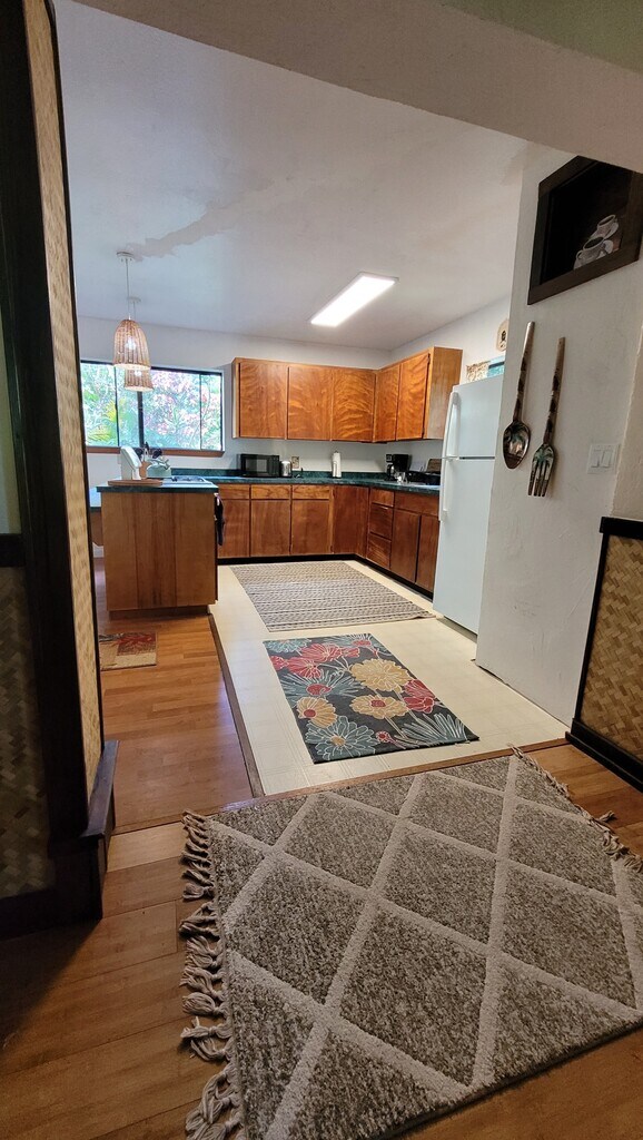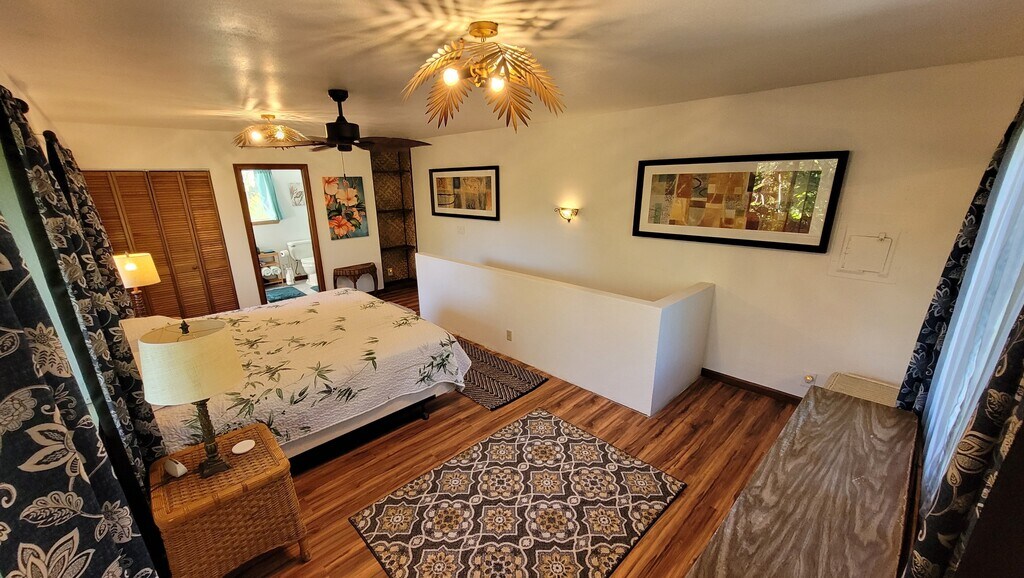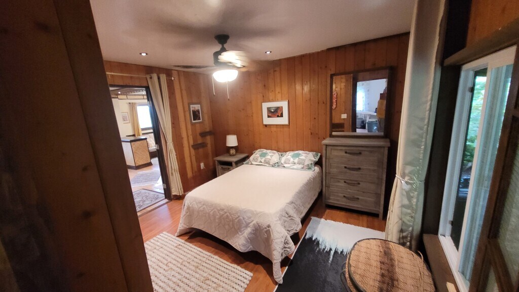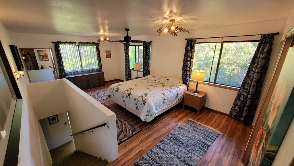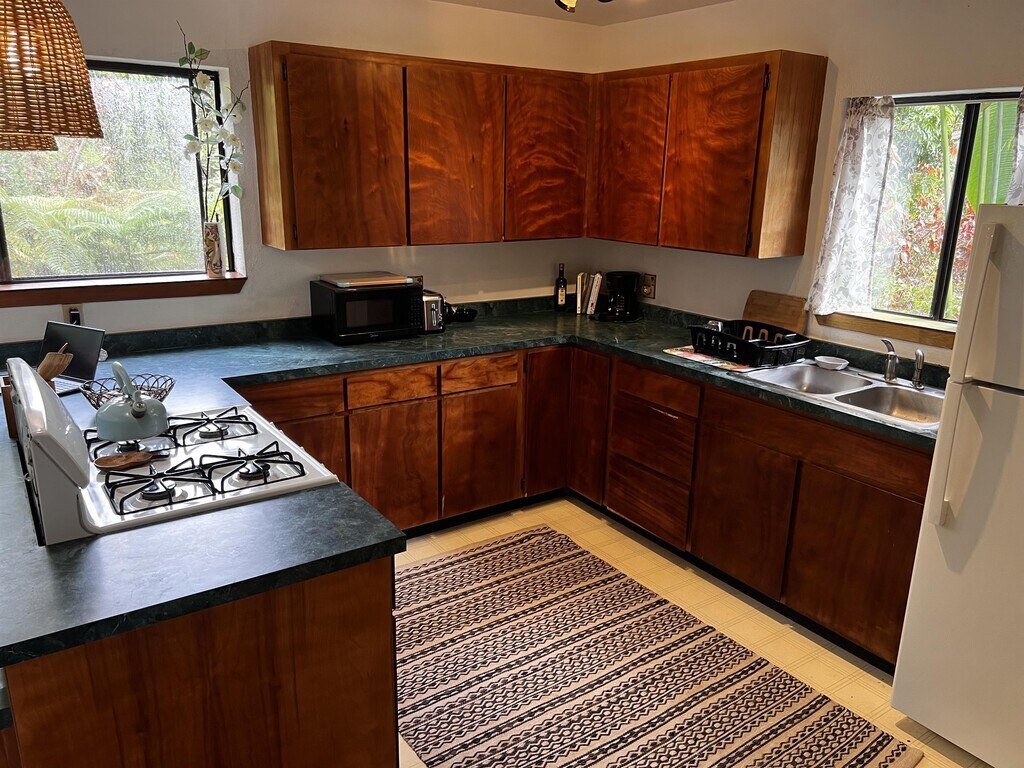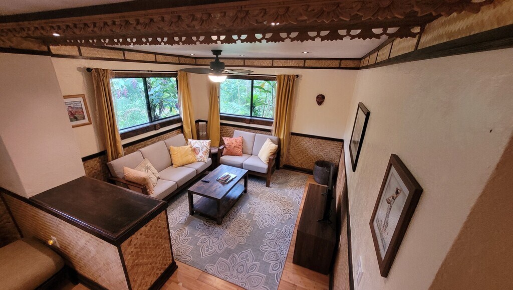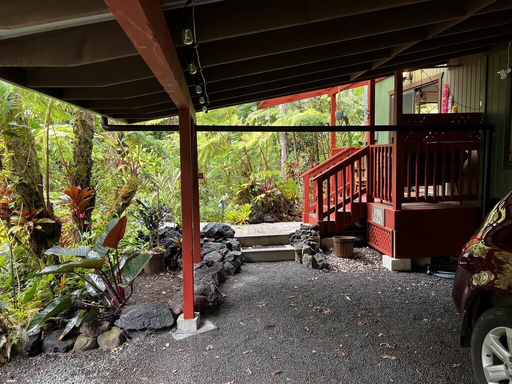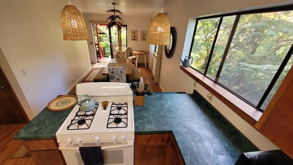 Fully furnished home with good energy available in a jungle paradise. Check out this furnished three-bedroom in Tiki Gardens. The primary bedroom is upstairs and has an en-suite bathroom. The guest bedroom is cozy and on the main level. The third bedroom is free of furnishings so you can use your own. Propane gas stove; laundry machines (gas dryer); high speed internet included. Tenant pays utilities; water is catchment. No pets. Vehicle rental is an option and in addition to the house rental. A Hilo Bay Realty application must be submitted before a showing; visit hbr dot managebuilding to complete an online application.
