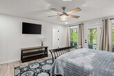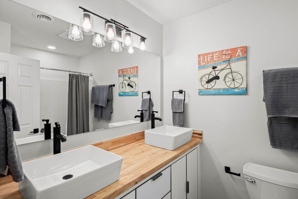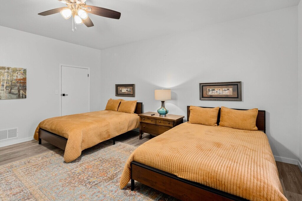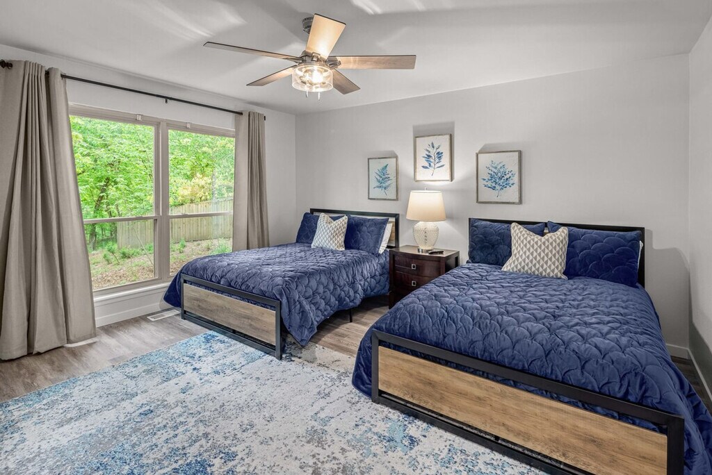 Escape to this spacious 5-bedroom, 4-bathroom retreat on Brompton Lane. Just steps from the lake and minutes from world-class mountain-bike trails, this pet-friendly lodge sleeps up to 15 guests. Enjoy a private deck, gourmet kitchen, game room, and fast Wi-Fi, perfect for family reunions, biking groups, and friends’ getaways. Welcome to your Bella Vista basecamp! Tucked between serene lake views and miles of scenic trails, this expansive home combines rustic charm with modern comforts. With room for your whole crew, it's the ultimate space to gather, relax, and explore Northwest Arkansas. The spacious layout includes 5 bedrooms and 4 bathrooms, including a master suite, accommodating up to 15 guests comfortably. The chef’s kitchen is fully equipped with stainless appliances, an oven, drip and Keurig coffee makers, a large island, and seating for group meals. The entertainment hub features a game room with ping pong, living rooms with large-screen smart TVs, and high-speed Wi-Fi. Outdoor living includes an expansive deck with a grill, firepit area, and outdoor dining, with direct access to water where kayaks and paddleboards are optional. Single-level living on the main floor offers easy access with wide entryways and a step-free shower in one bath. Up to two house-trained dogs are welcome for an additional fee of $75 per pet. The property offers secure garage storage and basic tools for bikes, and there is ample parking for up to 4-5 vehicles in the driveway, as street parking is not permitted. Nestled on the shores of Lake Windsor and directly on the Tunnel Vision trail, our quiet, established neighborhood offers privacy and seclusion to relax and recharge in nature. While there are neighbors, and you'll occasionally see bikers zip through the trails in the backyard, from the decks you'll feel like you're in a treehouse, surrounded by towering trees, chirping birds, and all nature has to offer. The home is located directly on Tunnel Vision trail and Lake Windsor, but is also in close proximity to other area attractions in Bella Vista and Bentonville, including 6 miles to Coler Mountain Biking Preserve, 8 miles to the Historic Downtown Bentonville Square, 10 miles to Crystal Bridges Museum, 2 miles to Mildred B. Cooper Memorial Chapel, 1 mile to Tanyard Creek Hiking Trail, and 3 miles to Blowing Springs Trailhead. Quiet hours are from 10 PM to 8 AM, and no parties or events are allowed. Smoking or vaping is prohibited inside, with smoking only in designated outdoor areas. Pets should be crated when unsupervised, and guests are expected to clean up after their pets. Trash and recycling should be placed by the curb on collection day, following local guidelines. Guests are encouraged to respect neighbors by keeping noise low and adhering to HOA rules and community regulations. The property offers high-speed Wi-Fi, making it remote work-friendly. Registration Number: STR-2023-51822 [SI]