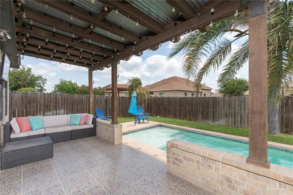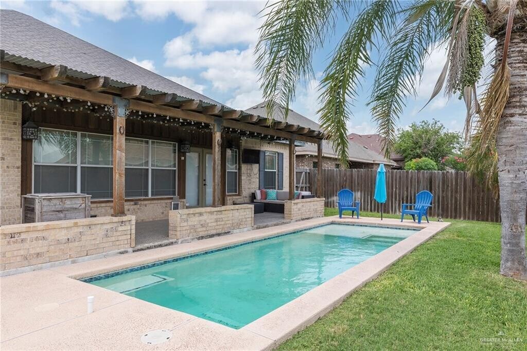 Call this gem of a house your very own! Enjoy the gated Country Meadows (Phase 2) subdivision with gated entry access from both Ware Road and from El Pacifico. Inside,it's open-concept with a breakfast nook and granite surfaces. Both the master suite and the living room open onto a "Texas Room," an air-conditioned extra space with built in full-length bar. Outdoors,a pergola styles a covered patio with plenty of lounge space and an in-ground pool. The backyard is fenced and abuts an empty lot,boasting a manicured palm and greenery. The garage is extra spacious,with room for 2 vehicles,unique built-in cabinetry,and bonus space for a workshop area. The 2 non-master bedrooms are split- bedroom style and share a lengthy Jack-and-Jill bathroom and built in closets between them. Appliances convey as well as both the indoor and outdoor mounted televisions! It's a bonus already.