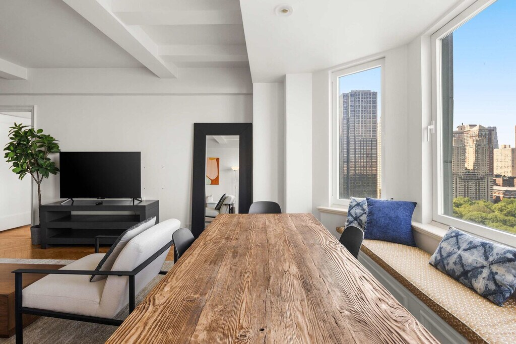 Welcome to Essex House, a luxurious 1-bedroom, 1-bathroom condo where sophistication and modern comforts seamlessly come together. Offering breathtaking, direct views of Central Park through a large bay window with custom built-in seating, it's a perfect spot to take in the iconic scenery. Enjoy 24-hour concierge, valet, and fitness center services. Upon entering, you're greeted by a gracious foyer that offers ample closet space, providing a welcoming introduction to the apartment. The large bedroom offers stunning Northwestern corner views, including sights of the Time Warner Center and Central Park. It also includes two roomy custom closets for ample storage. The beautifully updated full bathroom includes a shower with two attached water closets, one functioning as a separate powder room for added convenience and privacy. The pristine kitchen is fully equipped with premium appliances, marble countertops, and tile accents, making it a stylish and functional space for preparing meals or entertaining guests. Throughout the apartment, you'll find polished hardwood floors, vintage high-beamed ceilings, and grass cloth wall coverings that contribute to its timeless design. Oversized soundproof windows offer quiet serenity, while central air conditioning ensures year-round comfort. Complete with a smart TV, blazing-fast Wi-Fi, and a washer/dryer, this home offers a fully equipped living experience. Haus' concierge service can coordinate cleanings, private events, and more for guests. We're able to schedule private chefs and excursions. Utilities for this unit are included in the listed price, including Wi-Fi, electric, and heat. Excessive use of A/C exceeding $250 per month will be billed back to guests after move-out. Residents of this condo enjoy a range of top-tier amenities at the renowned Essex House, including 24-hour concierge, bell staff, security, and a fitness center. Located just steps from Central Park, Essex House provides an unrivaled location, close to fine dining, high-end shopping, and easy transportation options. This apartment offers an ideal combination of elegance, luxury, and convenience. Smoking is not allowed on the property. [SI]