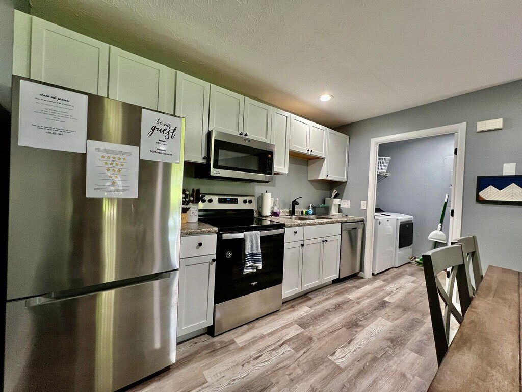 This pet-friendly home is great for folks needing transitional housing wile dealing with life events and changes. That's not to say you won't enjoy for a short stay as well! The neighborhood is very nice and friendly. The neighbors are mostly families and some have children. We are extremely close to Interstate 75 and you can easily access places like Mason, West Chester, Liberty Twp., and Middletown. When you enter the home you walk right into the living room area that is also open to the eat-in kitchen - you'll notice a lot of natural light shines in! LIVING ROOM You can watch your favorite shows on our large Roku TV while either lounging on the large and comfortable sofa or one of the two matching arm chairs. KITCHEN This kitchen has everything you need for your stay, including a Keurig coffee maker (with plenty of coffee), microwave, dishwasher and stovetop oven. The kitchen table seats six people comfortably. Since this is open to the living room, you can also enjoy the TV while sitting at the table. LAUNDRY ROOM This is located off the kitchen and has a free washer and dryer so you may do all your laundry during your stay (we provide the detergent and dryer sheets). BEDROOM ONE This queen bed is located in the back of the house, which you can also open the back door and step right out on the patio. Plenty of storage in the dresser and closet, a ceiling fan to keep you cool, plus a full mirror to ensure you look your best! Of course this room is also equipped with a Roku TV. BEDROOM TWO This bedroom also features a queen bed, dresser, closet, and a Roku TV for the most comfortable stay! BEDROOM THREE Perfect for kids! This room is a bunk bed where the top is a twin size and the bottom is full size. We also equipped this room with a dresser and a Roku TV. BATHROOM The bathroom is located in the hallway for everyone to shower (plenty of towels are just outside the door). This a tub/shower combination. SIDE PATIO Enjoy the sounds of nature while sipping your coffee in the morning or your wine at night. There is seating for four, plus a propane grill and gas fireplace. This home can sleep seven (7), but that would be by utilizing the couch.