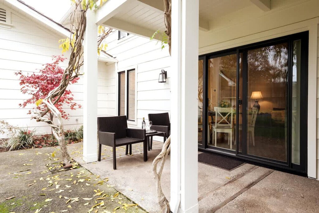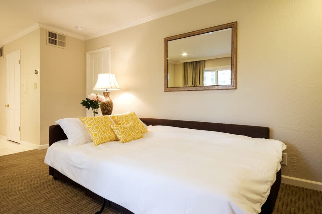 The advertised rate of $3,067/month is the lowest available price, based on a 30 day(s) stay with a move-in date of March 14, 2026. Rates vary depending on the duration of stay, season, and other parameters. For exact pricing and additional pricing components, please visit our website and enter your desired move-in and move-out dates. The rate is applicable when billed upfront; it can be higher if billed in multiple payments. Feel at home in this serene and stylish retreat near world-class wineries and top-rated restaurants. This apartment offers a private patio for relaxing with wine and scenic views. This apartment features a plush king-size bed with premium linens, a cozy living space with a Smart TV, fast Wi-Fi, and a fully equipped kitchen. Central air conditioning and heating ensure year-round comfort. Access to the resort pool is available seasonally, and the spa is available for a fee. A Tesla EV charger is available on-site. Pets are welcome with a $100 fee. Located steps from Silverado Trail and Napa’s best wineries, this apartment is also a 10-minute drive to Oxbow Public Market and downtown. Enjoy nearby hiking, biking, and hot air balloon adventures. Silverado facilities are a short walk away and include the main Mansion House with both indoor and patio bar dining, and the latest addition of Thomas Keller's Ad Lib restaurant. The Grill restaurant and bar, and the Pro shop are open to the public in the adjoining building. The Spa at Silverado is across the street and also open to the public. In the heart of the Napa Valley, plenty of open vineyard landscaping surrounds the Silverado Resort. Minutes away are the surrounding towns of Yountville, St. Helena, Sonoma, and Calistoga. Wineries dot the area by the hundreds, and top-notch culinary options are vast. Quiet hours are after 10 PM. Napa Valley is best explored in a car as the area is expansive. Uber is also available in the area. Self-check-in is available with a smart lock. [SI]