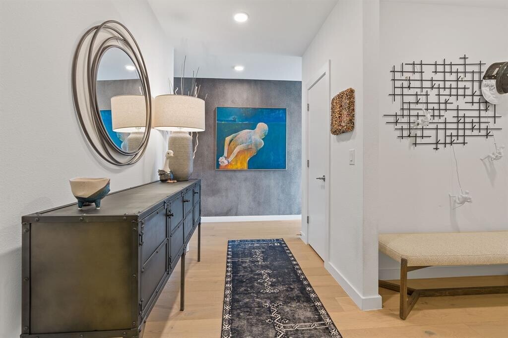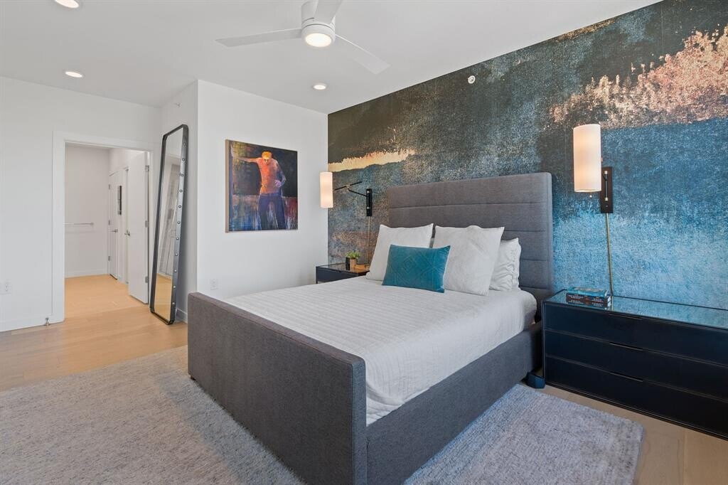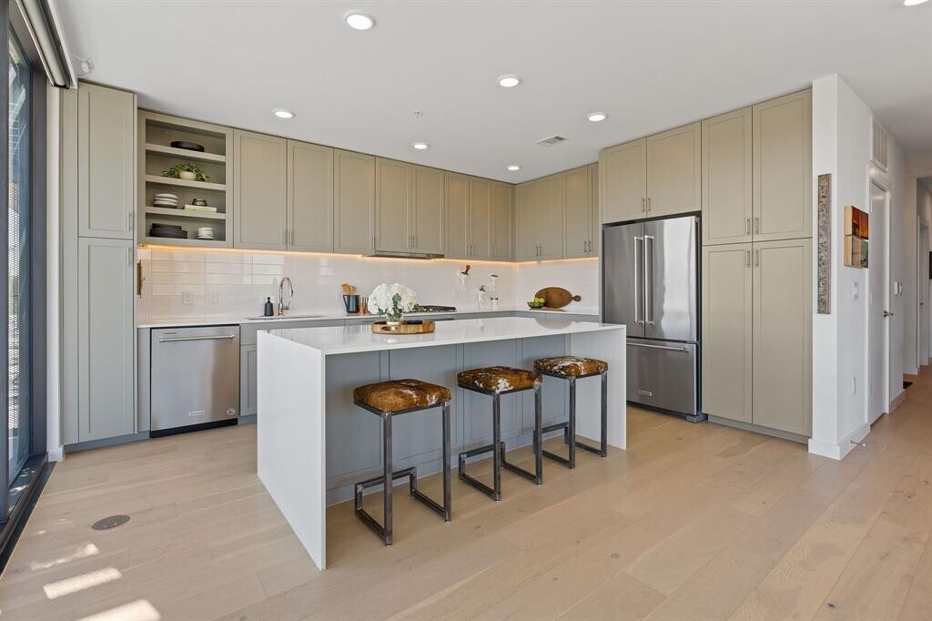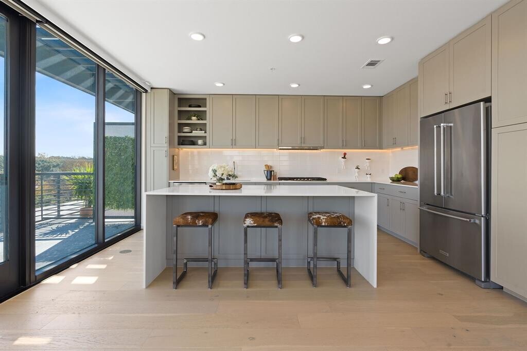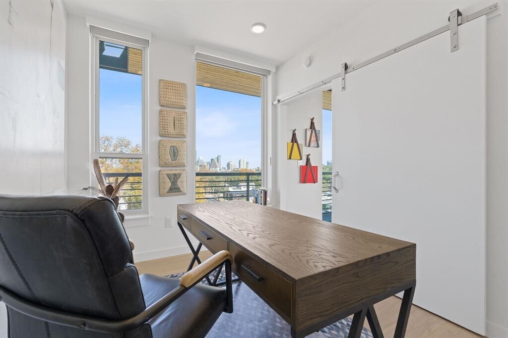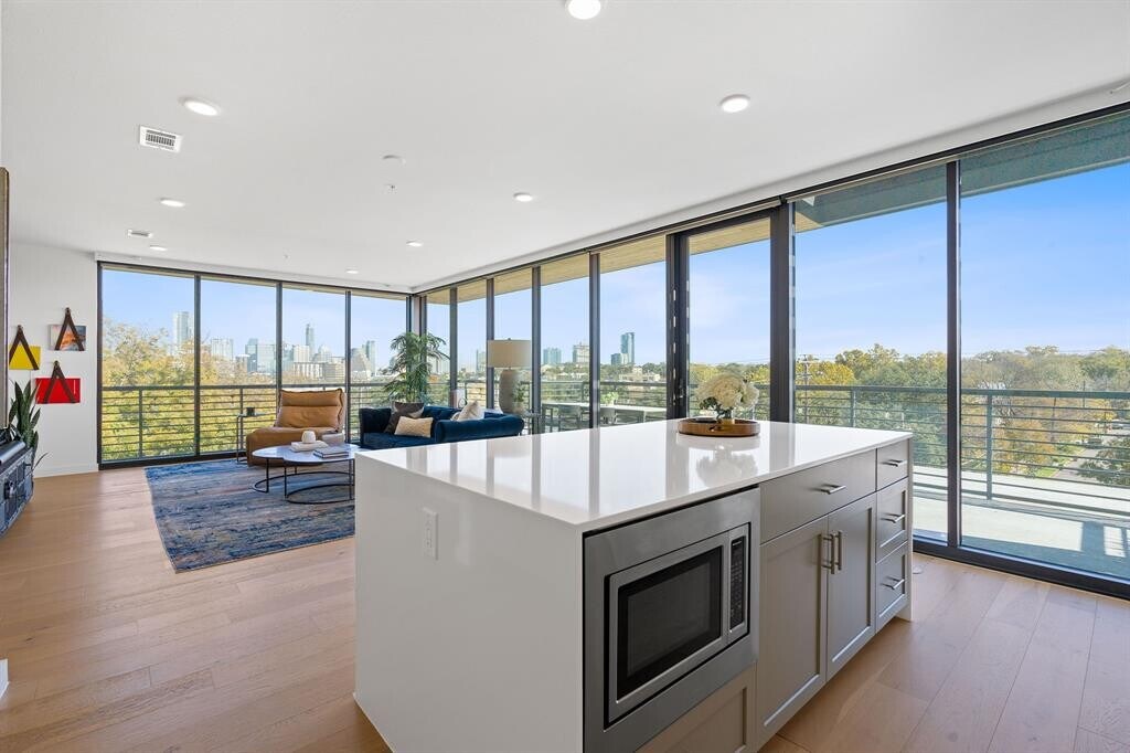 Welcome to elevated living on the top floor in the center of 78704. This sleek and sophisticated 1528-square-foot urban retreat offers 2 bedrooms plus a dedicated office, and an expansive wrap-around ~350 SF deck—a rare find in the heart of urban Austin. Positioned on a prime corner with unobstructed northeast panoramic views, this home captures breathtaking morning sunrises and the shimmering skyline, and in the evening, the Violet Crown casts a spectacular glow during sunset. Floor-to-ceiling glass floods the interiors with natural light and frames the cityscape from every room. The home centers around a designer kitchen with a massive island, dining space, and an inviting living area featuring curated lighting, custom drapery, statement wallpaper, a welcoming foyer, and a spacious walk-in laundry room. Just steps from South Congress, Auditorium Shores, and Downtown, you’re surrounded by some of Austin’s best restaurants, including Swedish Hill, Elizabeth Street Café, and Nomade. Whether you’re seeking a sophisticated pied-à-terre or a modern full-time residence, this top-floor sanctuary combines an unbeatable location with style, function, and unmatched views.
