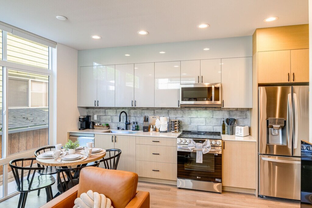 Feel at home in this trendy 2-bedroom, 2-bathroom townhome, located in a lively neighborhood minutes from downtown Seattle. This 1,064 sqft home is a 3-story plus roof deck townhome, and guests must be comfortable with stairs as there are multiple stories. This chic retreat features a kitchen stocked with high-end appliances, cookware, silverware, serving ware, spices, coffee, and tea. High-quality beds, mattresses, pillows, and linens ensure a comfortable night's sleep. An on-site washer and dryer are available for your laundry needs. Enjoy the rooftop patio with comfortable outdoor furniture for an al fresco experience. The Wi-Fi speed is 612 Mbps, perfect for smooth streaming and clear video calls. Well-trained dogs are welcome at $50 per pet per night. Located in Seattle's Central District, a historically significant and culturally rich neighborhood, this home is renowned for its diverse population and vibrant community. The Central District offers an eclectic mix of independently owned cafes, restaurants, and shops, and vibrant cultural events and street art. It's an easy commute to most areas of the city and is a great launching point for your Seattle trip. With a high walk score and many dining, shopping, and entertainment options within walking distance, it's also less than a 5-minute walk to many bus stops. Ride-share services are highly recommended. This is a pet-friendly home (dogs only), but please refrain from allowing pets on furniture/linens, including couches, throws, beds, pillows, and towels. Please do not leave pets unattended and bring poop bags to pick up after your pets. Strictly no parties and events are allowed, and quiet hours are between 10 pm and 8 am. No smoking or vaping of any kind is allowed anywhere on the property, including outdoor areas, and no digital piracy or shoes are allowed in the home. There is a $500 fine per violation. Registration Number: STR-OPLI-24-000361 [SI]
