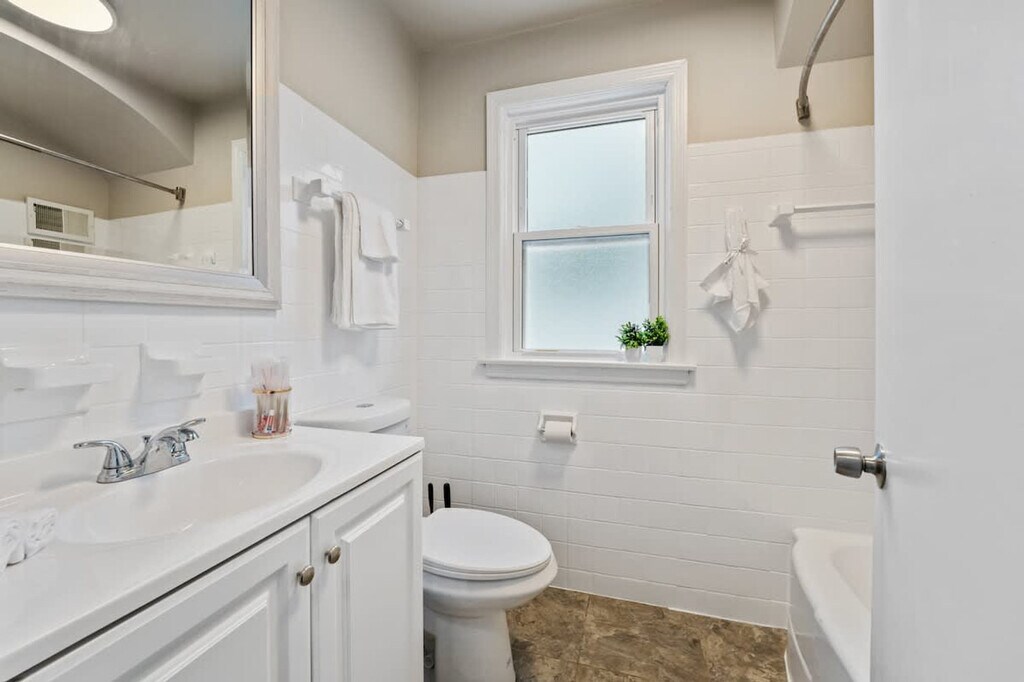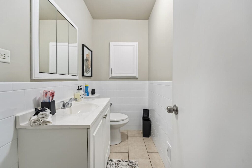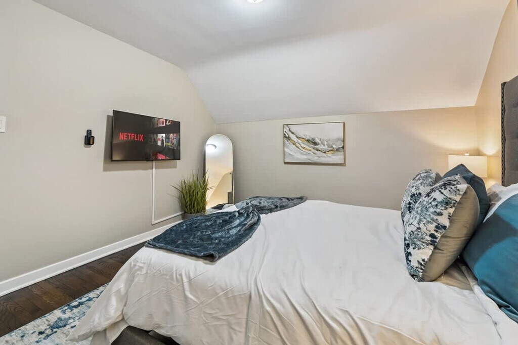 Step into a fairytale setting with this charming 3-bedroom, 1.5-bath home in Homewood, IL. Featuring a castle-like exterior, fenced backyard, and spacious layout, this home is perfect for families and groups of up to 6 guests. Conveniently located near local attractions, shopping, and dining, enjoy a blend of classic charm and modern amenities with high-speed Wi-Fi, Smart TVs, and a fully equipped kitchen. This charming home spans two floors with a unique castle-like shape and spacious fenced backyard. It includes three cozy bedrooms: a king-size bed in Bedroom #1 on the second floor, a queen-size bed in Bedroom #2 on the second floor, and two queen-size beds in Bedroom #3 on the main level. The home features 1.5 bathrooms with quality bath essentials, fresh linens and towels, and a fully equipped kitchen with a coffee maker and essentials. Smart TVs with streaming apps are also available. Pets are welcome with a fee of $125, with pre-booking pet information required. Stroll down memory lane in Downtown Homewood, where you can wander around charming shops, grab a coffee at a snug café, and chat with friendly shopkeepers. Enjoy small-town vibes with a sprinkle of something special. Visit local parks or step out for a night on the town at the Rialto Square Theatre. Tennis courts, restaurants, a train station, grocery stores, and a shopping center are all close by. If you're itching for some big city excitement, Chicago is just a hop away, offering sightseeing, museums, and nightlife before returning to your peaceful retreat in Homewood. Guests must be at least 21 years old to book. There is a strict no-party policy, and quiet hours start at 10:00 PM. Violations, such as unreported guests or property damage, will result in a $500 fine and immediate eviction. Indoor smoking will incur a $500 fine. Occupancy is limited to the number of guests stated on the listing description, with babies under the age of two not included in this count. Tampering with or breaking the outside camera will result in a $350 maintenance repair fee and immediate eviction. Early or late checkouts may be accommodated for a fee and by request only, with a $100 unauthorized late checkout fee applied for checkouts later than 11:00 AM. High-speed Wi-Fi and Smart TVs make this home great for remote workers. [SI]