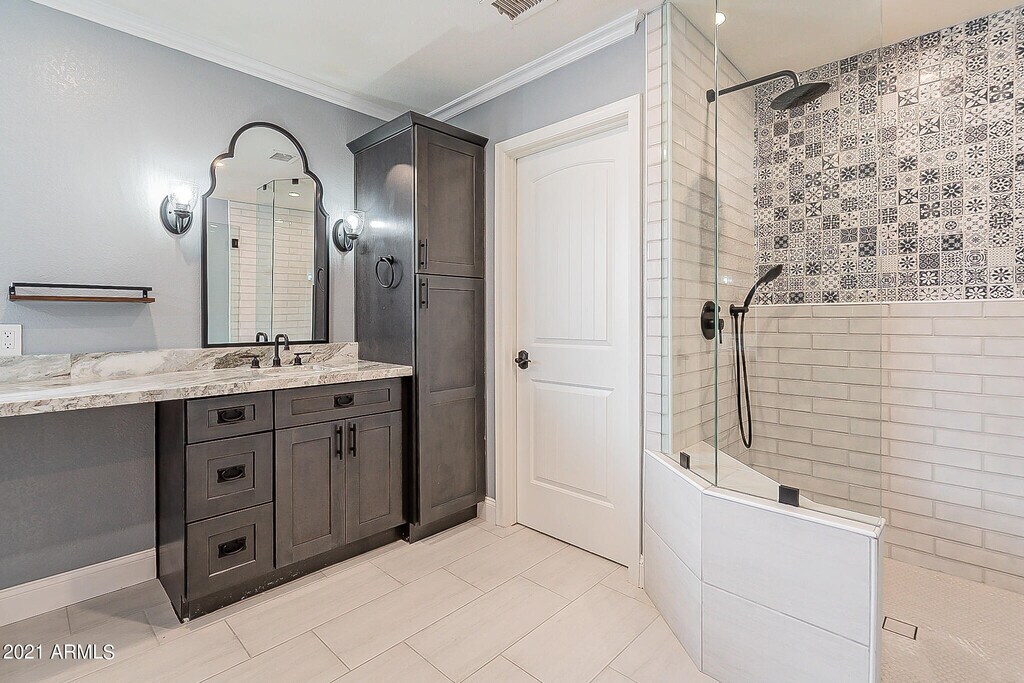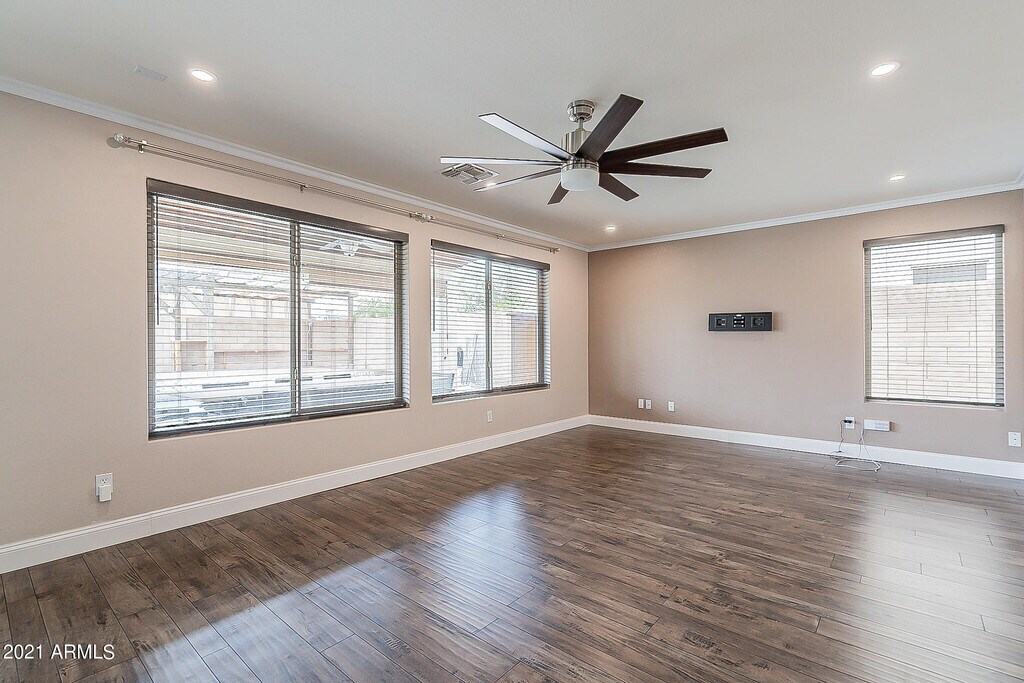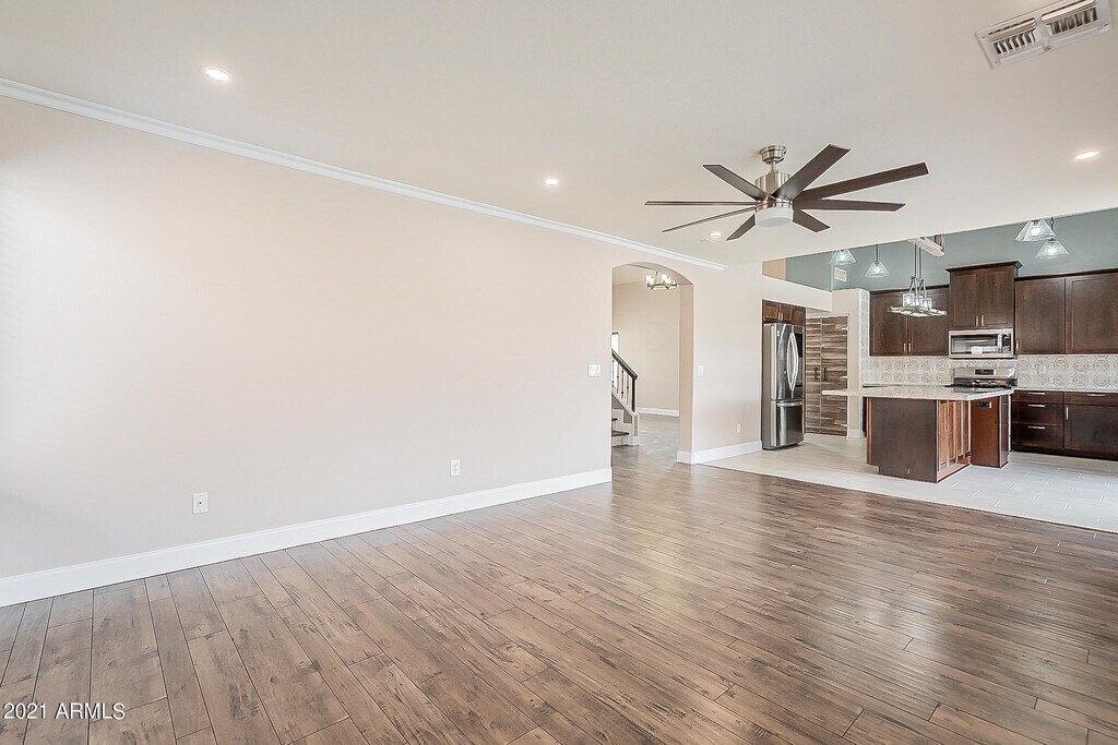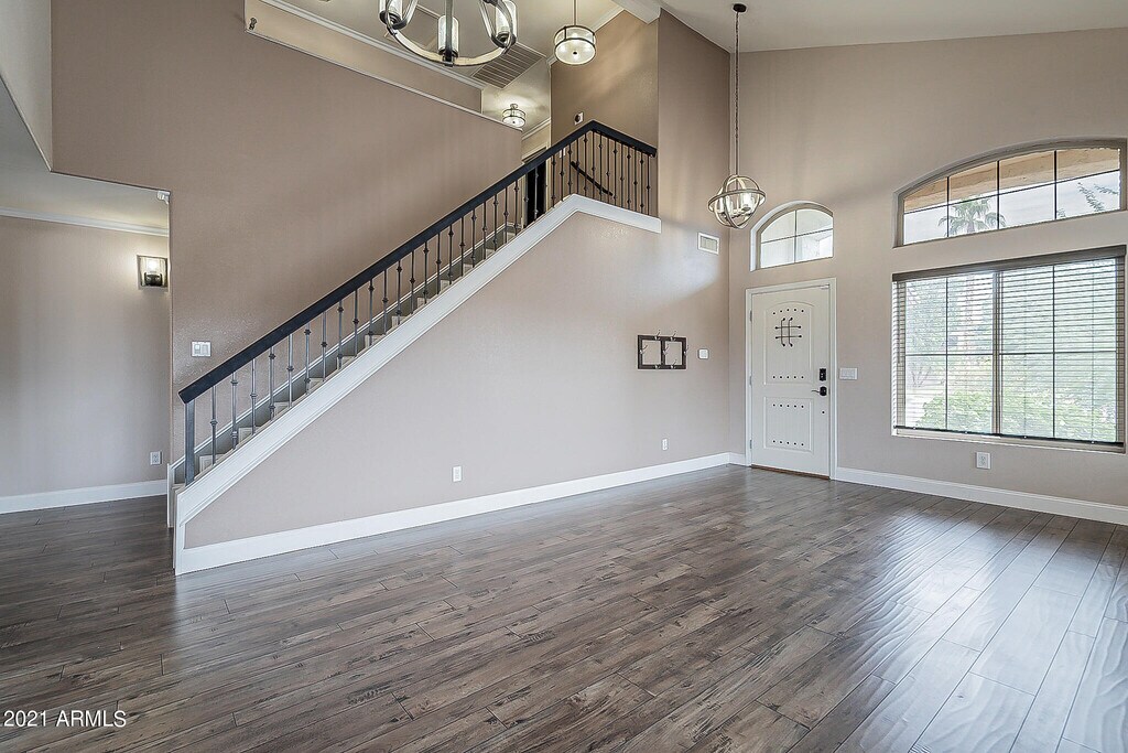 Rent this updated 4 bed 3 bath home in Ahwatukee Foothills. Enter to vaulted ceilings,designer paint,crown molding,unique light fixtures,wrought iron staircase,& stunning wood floors. Remodeled kitchen features dark cabinets,enormous island w/storage,granite counters,gas cooktop & stainless appliances. View AMAZING backyard & pool from the kitchen & family room. 1 Bed & full bath down! Large great room,dining & laundry also on 1st level (Fridge,W&D included). 3 large bedrooms upstairs & bathrooms w/ custom cabinets,tile floors,& granite counters. The master bath features designer shower! Corner lot w/ NO MOWING artificial turf,incredible pool & raised seating area for those pool parties. Full Pool Service included. 1 year min lease. Earnest becomes Security Deposit.