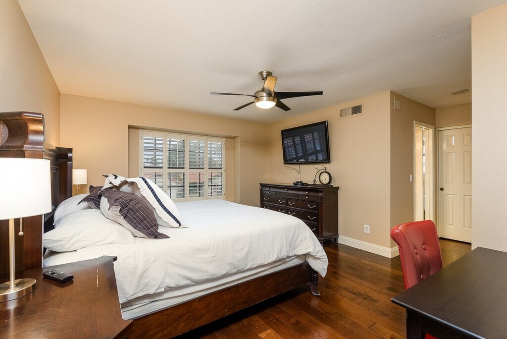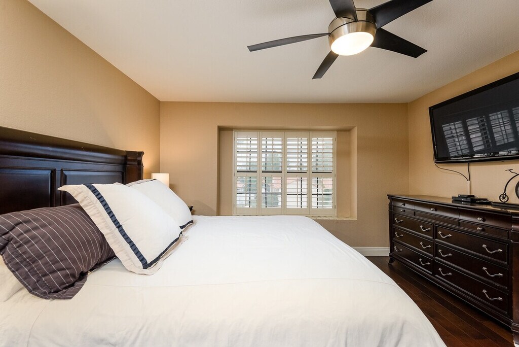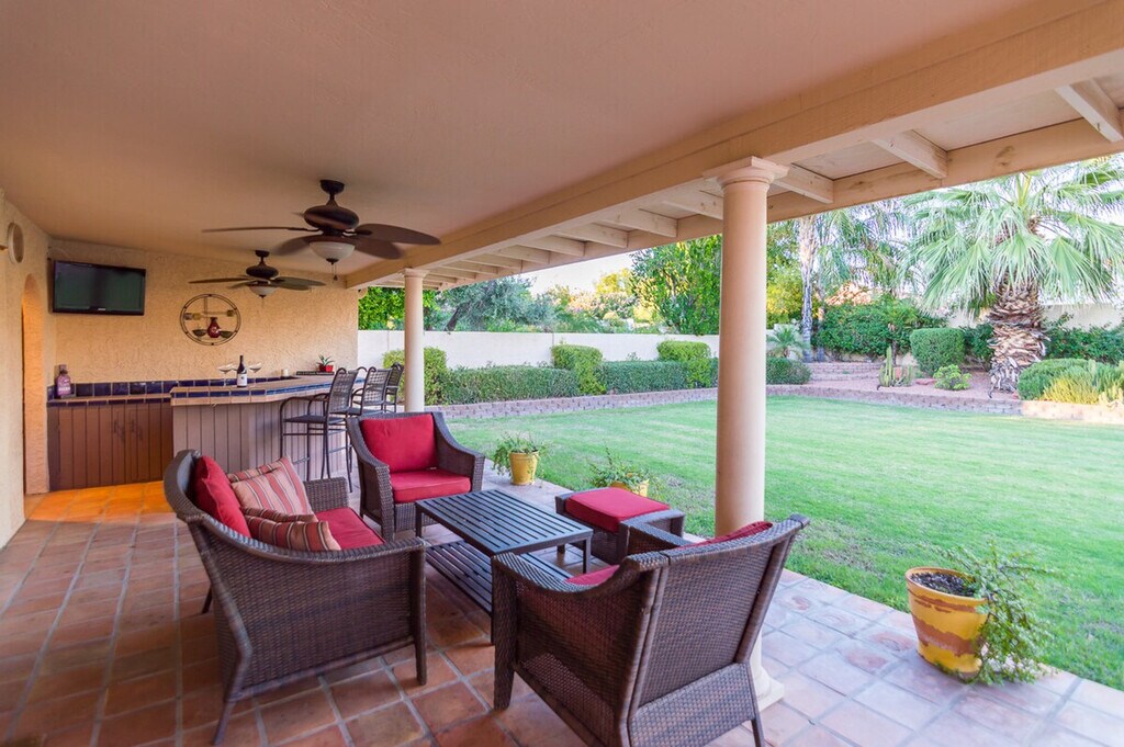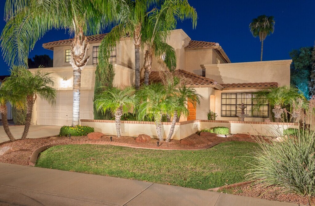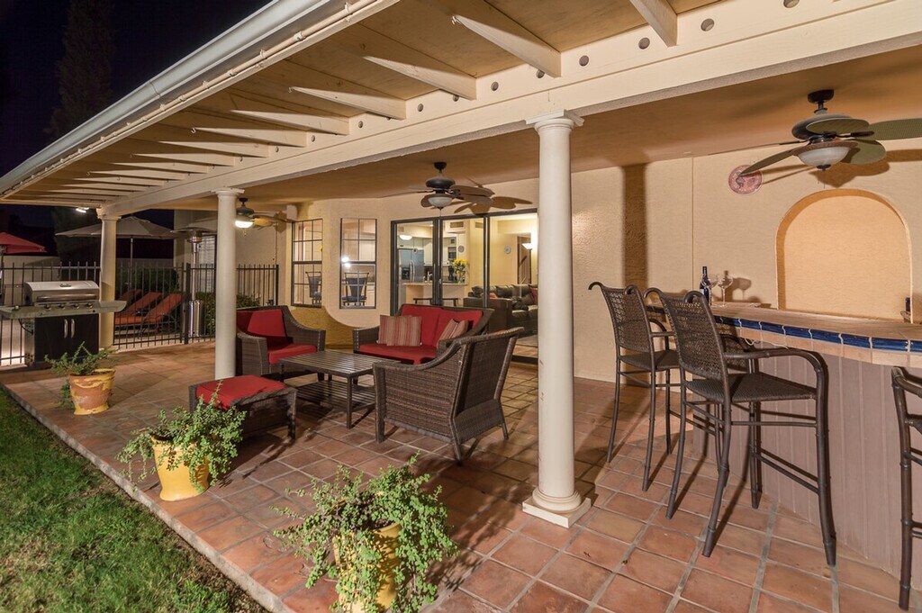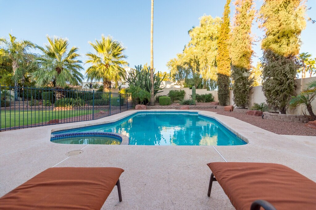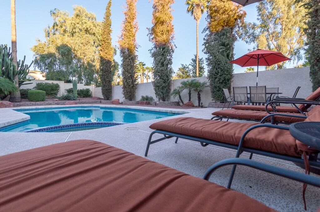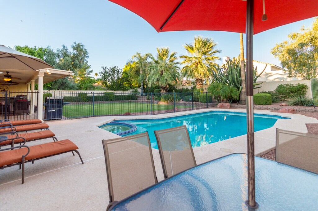 Welcome to Casa Kierland, a fully furnished 2-story single-family home located in the highly sought-after Kierland area of North Scottsdale. This spacious home features four bedrooms and two and a half bathrooms, providing ample space for relaxation and entertainment. The master bedroom includes a king-size bed, a flat-screen TV, and a workstation with a printer, while the other bedrooms offer a variety of sleeping arrangements to comfortably accommodate up to eight guests. The property also boasts a private pool with a child-safe view fence and an attached spa, perfect for enjoying the beautiful desert evenings. Casa Kierland offers plenty of indoor and outdoor entertaining spaces, including a family room with a large flat-screen TV, a fully stocked kitchen, and a separate living room with additional seating and entertainment options. The formal dining area can seat ten comfortably, and the glass sliding doors open to a large outdoor covered patio equipped with a stainless steel BBQ, a built-in wet bar with a full-size fridge, and a flat-screen TV. The patio is cooled by a misting system and ceiling fans, and an outdoor patio heater is available for cooler evenings. The property also includes a private garage, a 3-car driveway, and an RV gate. Guests can enjoy the private pool and spa, with an additional fee for heating. The pool and spa are heated using a propane heater, and guests are responsible for the propane used. A private garage is available for parking, along with a 3-car driveway and RV gate. One dog is allowed with approval, and a non-refundable pet fee will be added to your booking. All linens, towels, and paper products are provided, along with a fully stocked kitchen. Situated close to the shopping and dining at Kierland Commons, the Scottsdale Quarter, and the Westin Kierland Resort, Spa & Golf Club, Casa Kierland is centrally located to all the culture, nightlife, and natural beauty that the Valley of the Sun has to offer. This prime location ensures easy access to a variety of attractions and activities. Guests are liable for any damages caused to the property. The property provides free Wi-Fi and includes all linens, bath, and pool towels. Check-in and check-out times are flexible, and the property is equipped with a washer and dryer for your convenience. [SI]