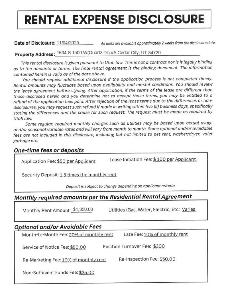 The rental at 1604 S 1500 W is currently listed at $1,395.