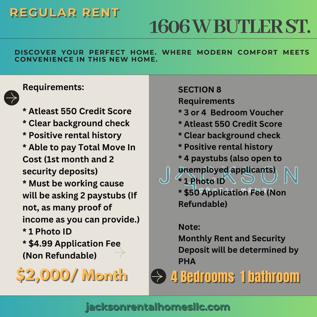 There is currently a 4 Bed 1 Bath Home for rent sq ft listed at 1606 W Butler St. It is Available Now.