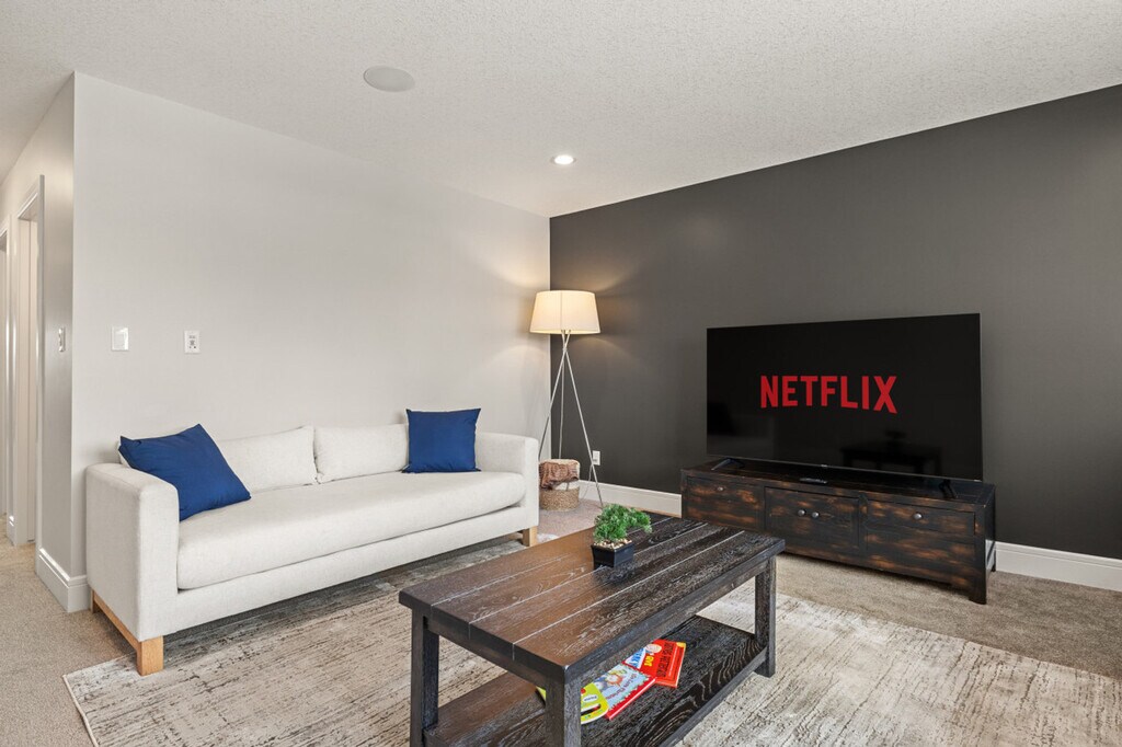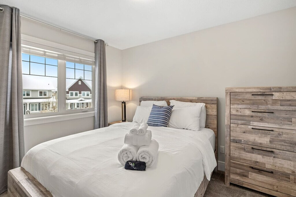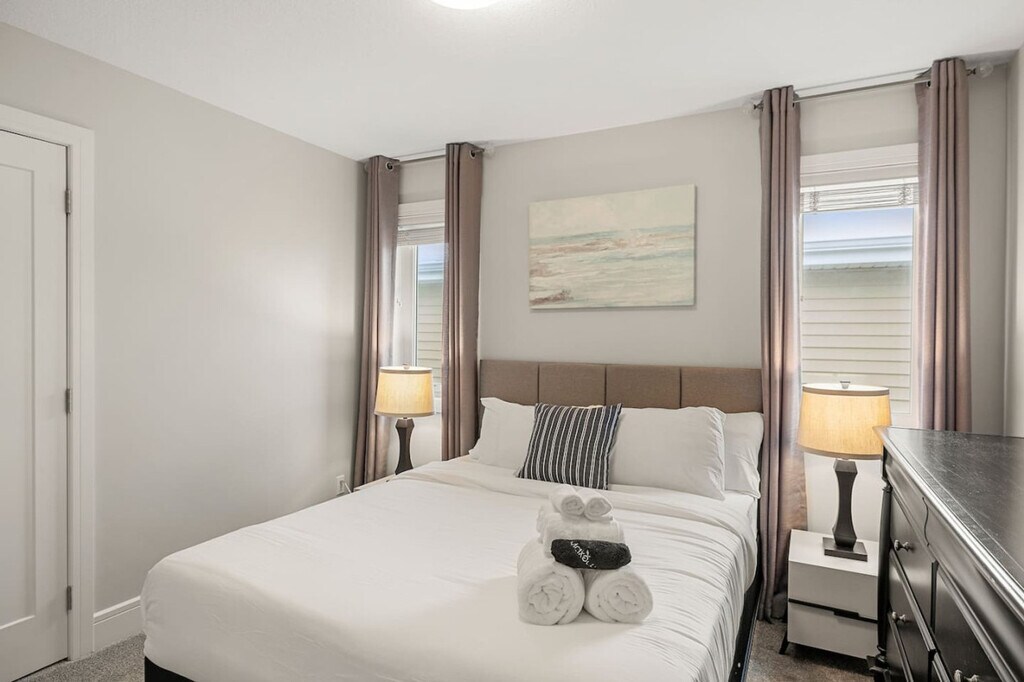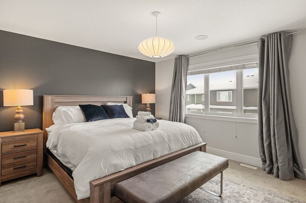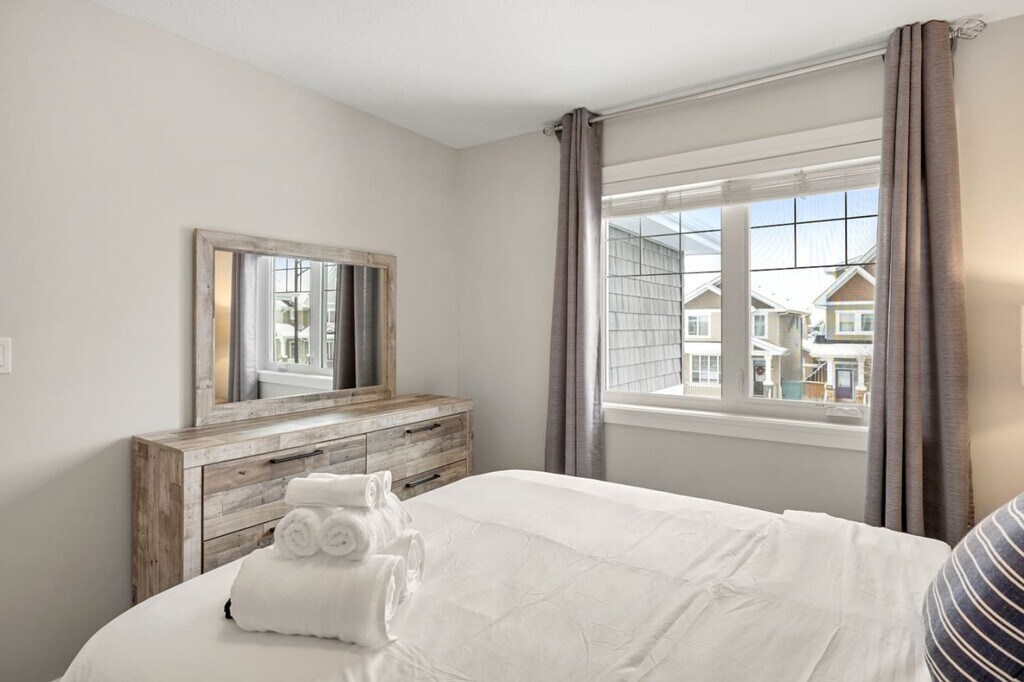 Experience luxury and comfort in this fully detached home located in the picturesque neighborhood of Keswick. This spacious residence offers three bedrooms, including a king-size bed and two queen beds, along with two full-size bathrooms and a half bathroom. Enjoy the privacy of having the entire home to yourself, complete with two living rooms featuring three comfortable sofas, a fireplace, and central AC and heating. The home also includes an office with a 24-inch monitor, a fully equipped kitchen, and a washer and dryer. A double car garage is available for your convenience. The home is thoughtfully designed with modern amenities to enhance your stay. Relax in the two inviting living rooms, each equipped with a 65-inch smart TV and Netflix access. The kitchen boasts stainless steel and custom appliances, including a 4-burner stove, oven, microwave, refrigerator, freezer, and dishwasher. Enjoy complimentary coffee, tea, and water, and dine in the large dining area with island seating and bar stools. Premium linens and pillows are provided for all sleeping arrangements, ensuring a restful night's sleep. Parking is hassle-free with options including a double car garage, driveway parking, and street parking. Additional supplies can be provided during your stay at an extra cost. Situated in a transit-friendly and developing neighborhood, this home offers easy access to Edmonton Transit Service bus routes, making it convenient to explore the city. The area is becoming increasingly walkable with ongoing enhancements to pedestrian pathways and local amenities. Nearby attractions include Sobeys Heritage Valley, Shoppers Drug Mart, Currents of Windermere, and South Edmonton Common, all within a short drive. Major highways, such as Anthony Henday Drive, are just minutes away, facilitating quick travel around Edmonton. Check-in and check-out are fully self-service, providing flexibility for your arrival and departure. The property enforces a strict no-smoking policy, with a $250 CAD fine for violations. Quiet hours are from 10 pm to 7 am to ensure a peaceful environment. No parties, drugs, excessive drinking, or loud music are allowed, and a noise detector is in place to monitor sound levels. Unauthorized late check-out will result in additional fees. Guests are responsible for following city guides on waste disposal, and any infractions may incur fines. Please remove outdoor shoes while inside the home. The home features an office area equipped with a 24-inch monitor, making it ideal for remote work. Fast Wi-Fi is available throughout the property, ensuring a seamless work-from-home experience. A laptop computer is not included. Registration Number: 499696639-001