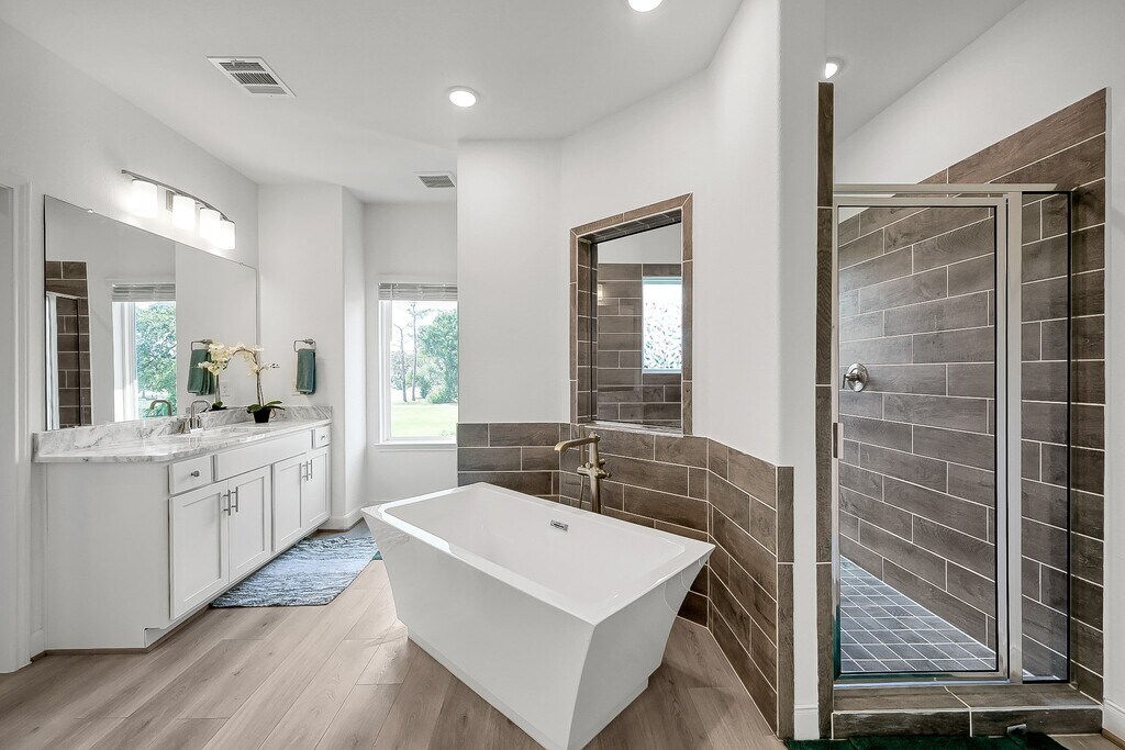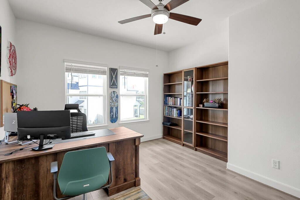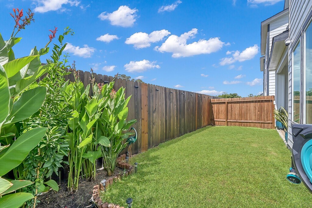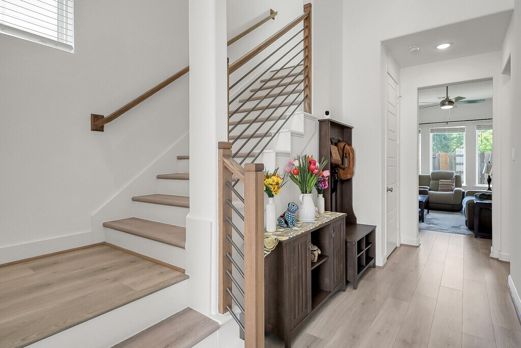 Welcome to this stunning three-story farmhouse-style home located in a secure gated community,combining timeless charm with modern luxury. The elegant entry opens to a bright,open layout filled with natural light and finished with durable Hardy Plank flooring and premium tile,no carpet throughout. The gourmet kitchen features a farm sink,upgraded quartz countertops,and luxury lighting,perfect for both daily living and entertaining. On the second floor,the oversized primary suite offers a spa-inspired bathroom with a freestanding tub and walk-in shower. Also upstairs is a spacious study with its own half bath and a convenient laundry room. The third floor includes two oversized bedrooms with a full bath. Every bedroom is equipped with ceiling fans for year-round comfort. With no back neighbors,privacy is ensured while still enjoying easy access to I-10,Downtown Houston,and Katy. A rare opportunity to own a home designed with elegance,comfort,and convenience in mind. MLS# 76249899