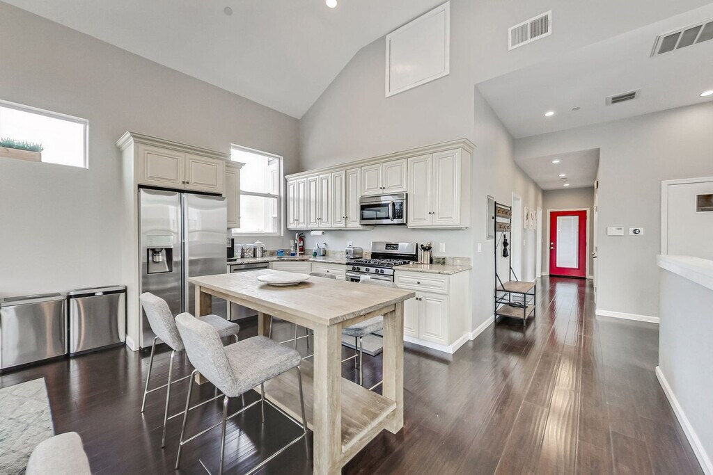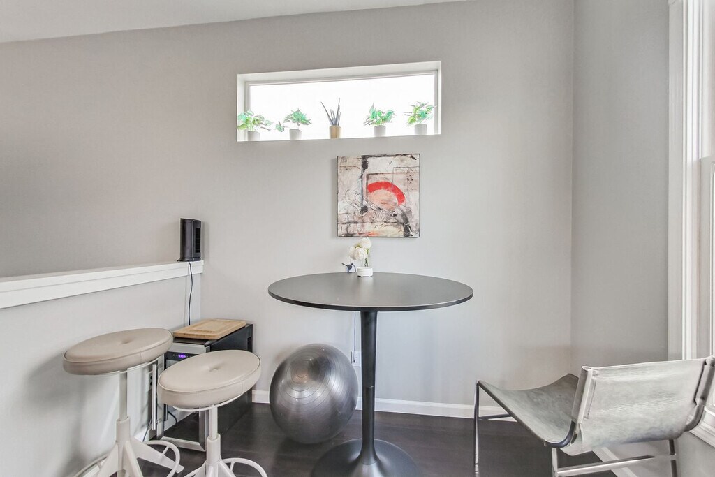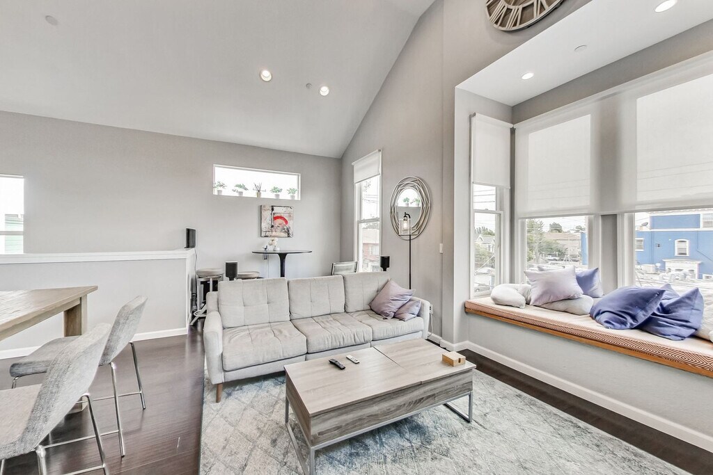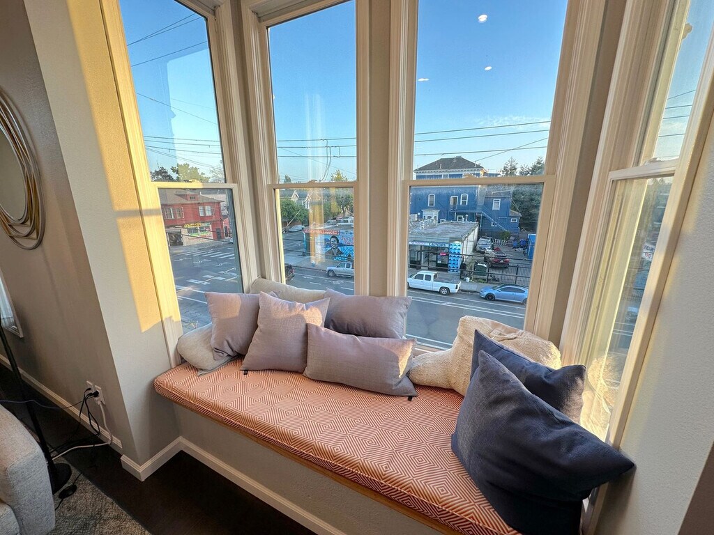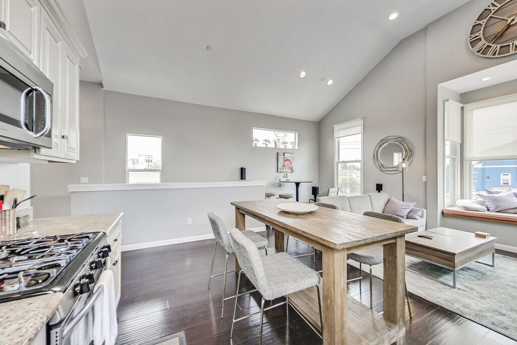 Situated in the up-and-coming West Oakland neighborhood, this home offers easy access to San Francisco via freeway or BART. Newly painted with beautiful hardwood floors and high ceilings, the house features a large open concept living, dining, and kitchen area, making it a comfortable home base for your vacation or work trip. The property is on the top level of a three-story house, requiring climbing a significant number of stairs, including a large flight from the ground level to the entry door and a long flight inside to the flat. The property is fenced and equipped with a gate with an electronic lock. The front of the unit boasts an open concept living, dining, and kitchen area, furnished to create distinct dining and living spaces. A sofa faces the UHD TV and is equipped with a Sonos sound system. The dining table seats four, with an additional sitting area behind the sofa providing two more chairs for larger groups. The shared bathroom is located at the top of the stairs next to the washer and dryer. The master bedroom, located at the end of the hallway, features a walk-in closet and an en-suite bathroom with a walk-in shower. The shared bathroom includes a shower over tub. Premium designer linens and towels, coffee and tea, and Kiehl's bath and body products are provided. Located in West Oakland, a historically working-class neighborhood, the area is filled with industrial warehouses, ornate Victorians, and new condo developments. The neighborhood's proximity to Emeryville, Berkeley, and San Francisco via the San Francisco–Oakland Bay Bridge and BART makes it a central location with warmer weather than San Francisco. Within walking distance, you'll find a lively farmer's market every Sunday morning, Kowbird fried chicken, Horn barbecue, Kilovolt coffee, and rock climbing at the old Pacific Pipe warehouse. The West Oakland BART station is about an 11-15 minute walk from the condo. Common sense is encouraged in this up-and-coming area, as surroundings can be dirty at times and there can be incidents of crime. Do not leave valuables in your car, and if your car has a trunk, leave the seats folded down to show the trunk is empty. Pay attention to your surroundings and avoid being distracted on your phone. A digital guidebook with information about the house and neighborhood will be sent with your check-in instructions. Enhanced cleaning and sanitation procedures have been implemented, which increases the total cleaning fee rate. [SI]