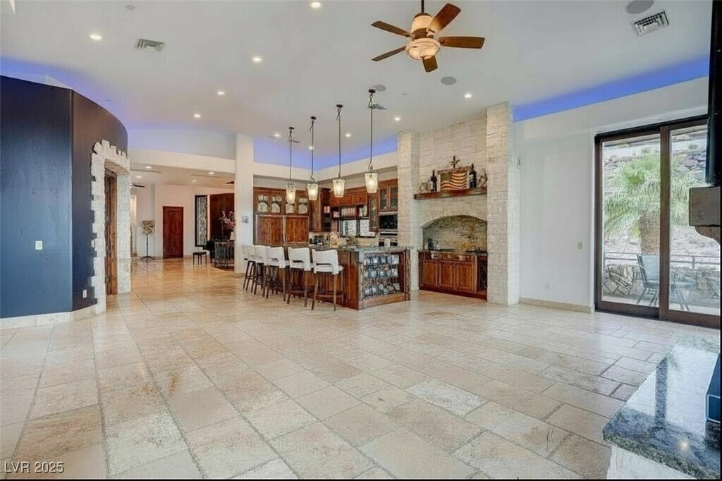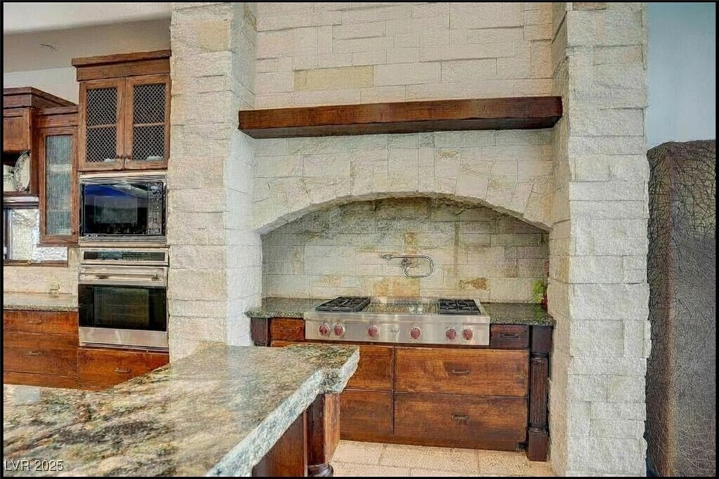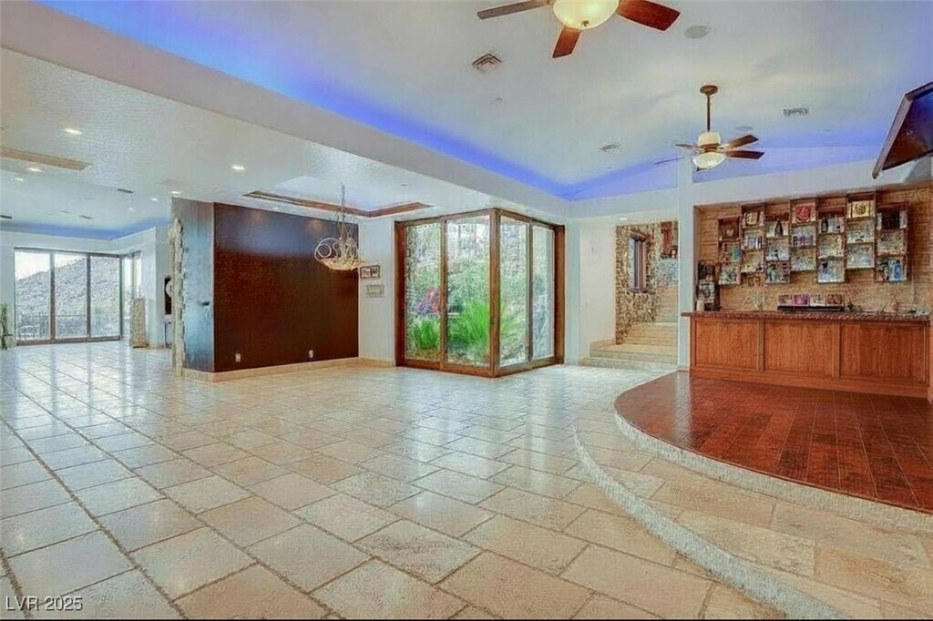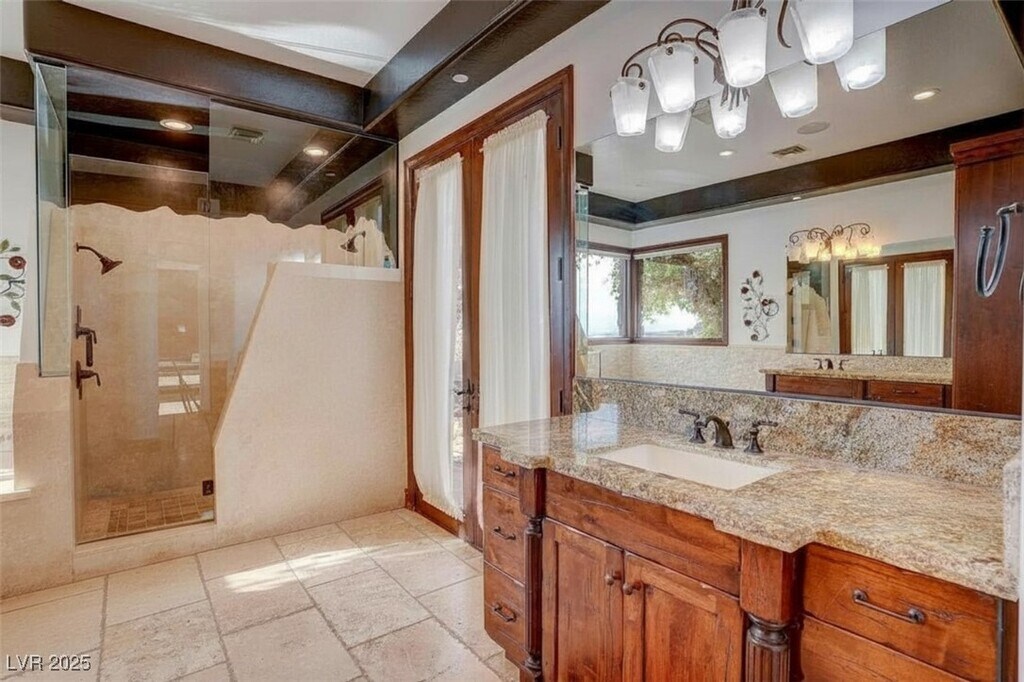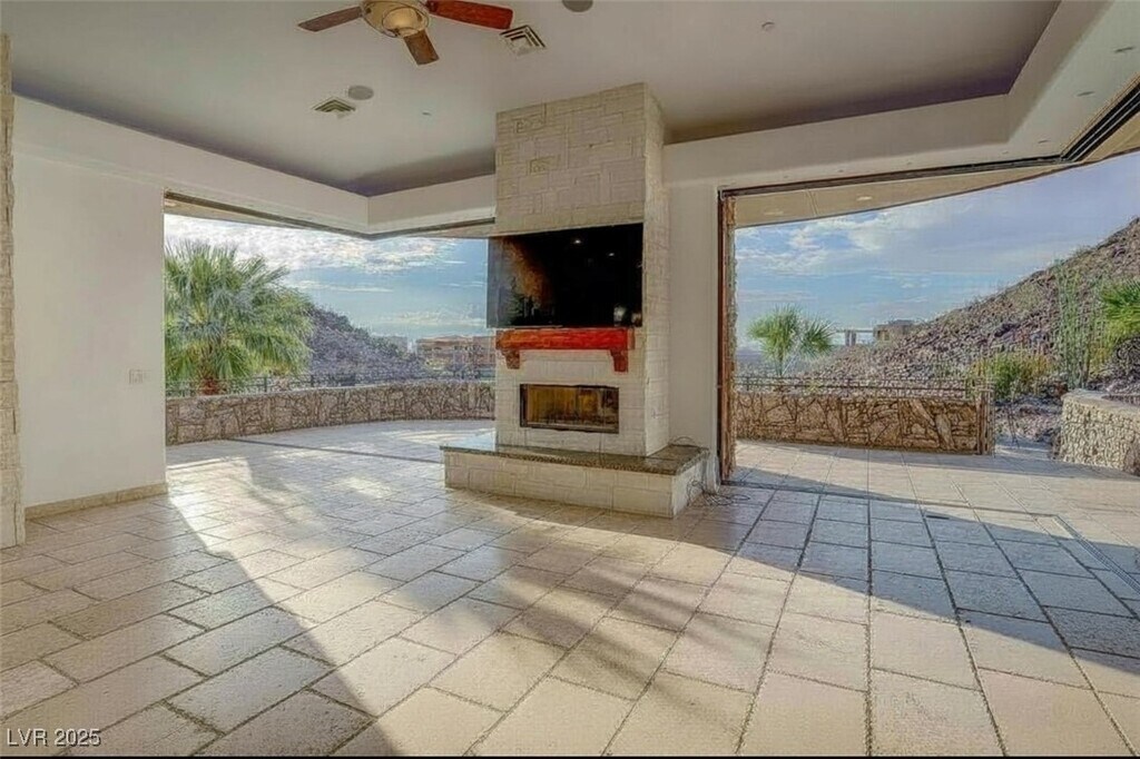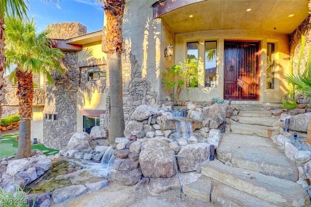 This unique home sits on 2.1 acres and is nestled at nearly the top of the mountain on Liege Dr. in MacDonald Highlands Premier Community. This custom home offers unique architecture with natural stone, distressed wood, grandiose floor to ceiling windows, multiple levels of outdoor entertaining areas, and resort style pool and spa. Unique custom features include a custom outdoor cooking area, multiple lounging decks, fire pit, putting green, gym equipped with steam and sauna, two-story owner's closet, theater, game room and so much more. This home also offers an oversized garage that will easily accommodate an RV, 6+ vehicles, boat storage, and a home workshop. Plus enjoy breathtaking views of the natural terrain plus views of the city and Las Vegas Strip. Placed behind a second guard gate, this home is luxury and serenity at its finest.