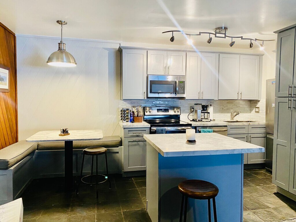 Available for 6-Month Lease | 2 Bed + Loft / 2 Bath | 1,182 sq. ft. | Walking Distance to the Village and close to Shuttle Services |Mammoth Lakes, CA Welcome to San Sierra Condominiums, where modern design meets cozy mountain living in the heart of Mammoth Lakes. This beautifully updated 2-bedroom + loft, 2-bath condo offers comfort, style, and the perfect home base for the 2025–2026 winter season. Step inside to an inviting, open-concept living area featuring vaulted ceilings, contemporary furnishings, and a sleek tiled fireplace — ideal for relaxing after a day on the slopes. The living space is accented with warm wood paneling and modern mountain décor, creating the perfect blend of rustic and refined. The fully updated kitchen showcases modern cabinetry, quartz countertops, stainless steel appliances, and a spacious island for dining and entertaining. Each bedroom is comfortably furnished with plush bedding and soft lighting, while the loft area provides additional sleeping or lounge space for guests. Both bathrooms feature modern fixtures and bright finishes for a clean, refreshed look. This nicely furnished condo offers access to San Sierra’s community patio with barbeques and tables, a jacuzzi, and a sauna — perfect for unwinding after a long day on the mountain. Convenient on-site parking, ample gear storage, and proximity to The Village at Mammoth, shops, and restaurants make this a top winter choice. Enjoy the best of Mammoth living in this modern, move-in-ready retreat — thoughtfully designed for comfort, convenience, and unforgettable winter memories. Tenant is responsible to pay for electricity.