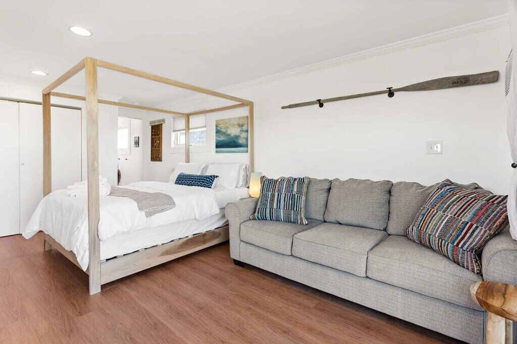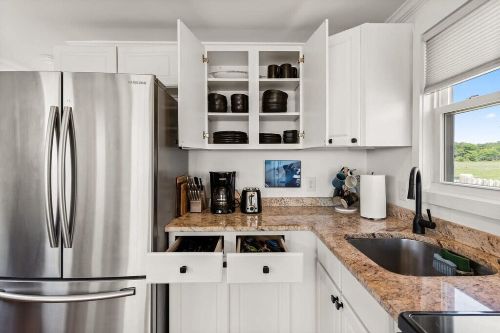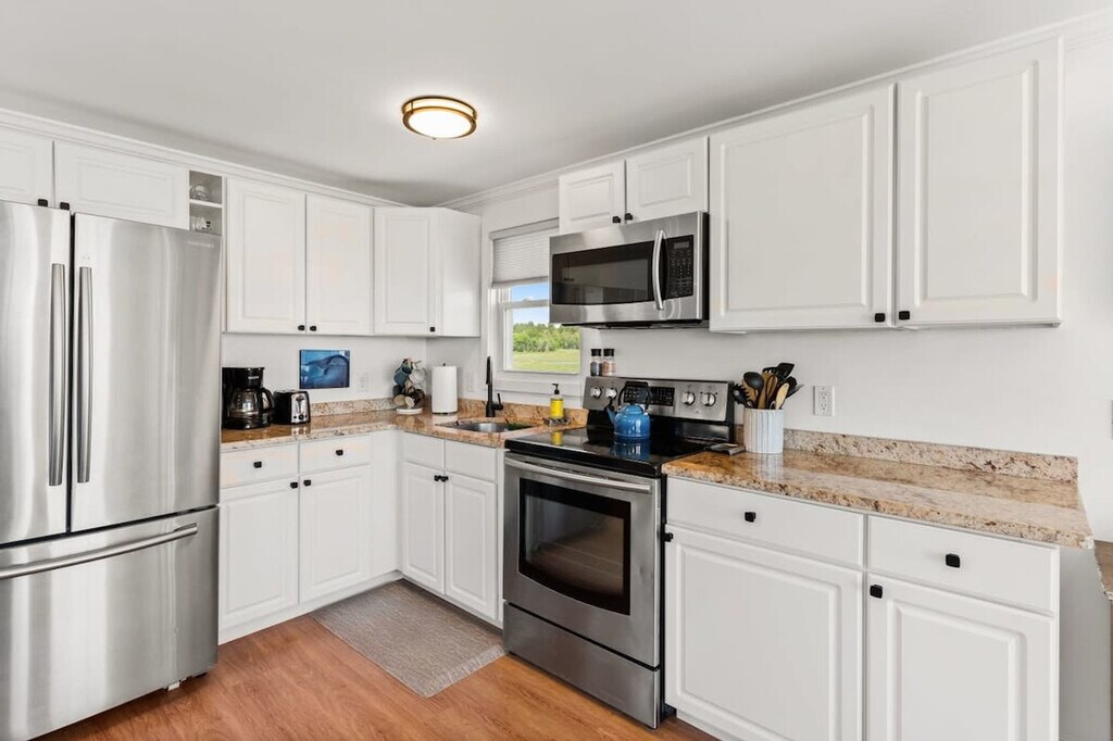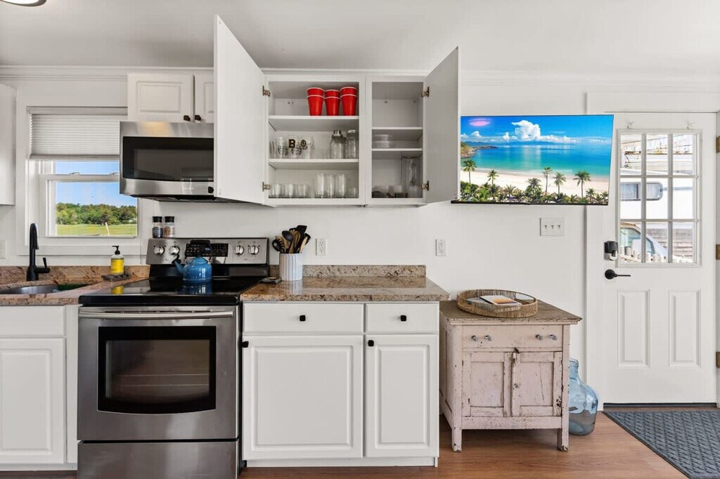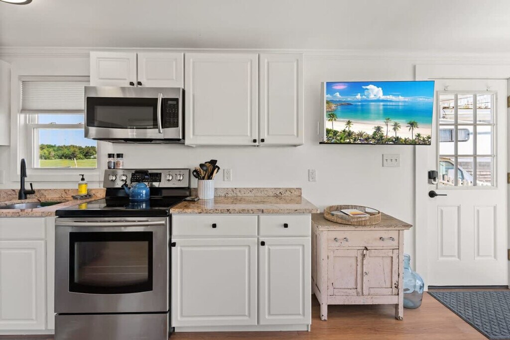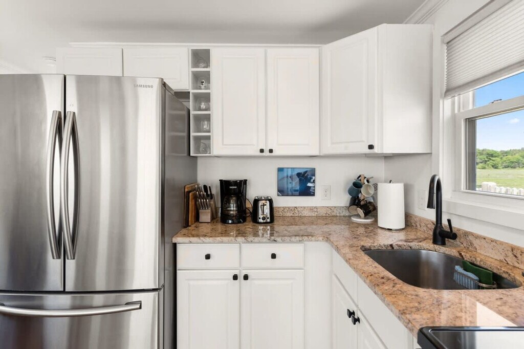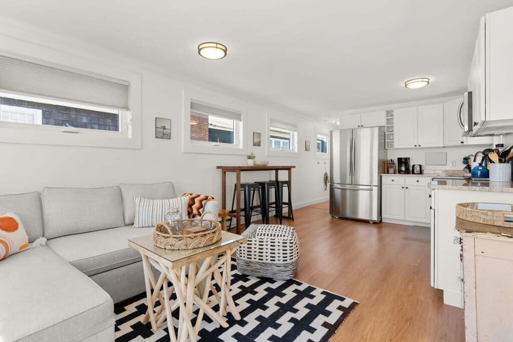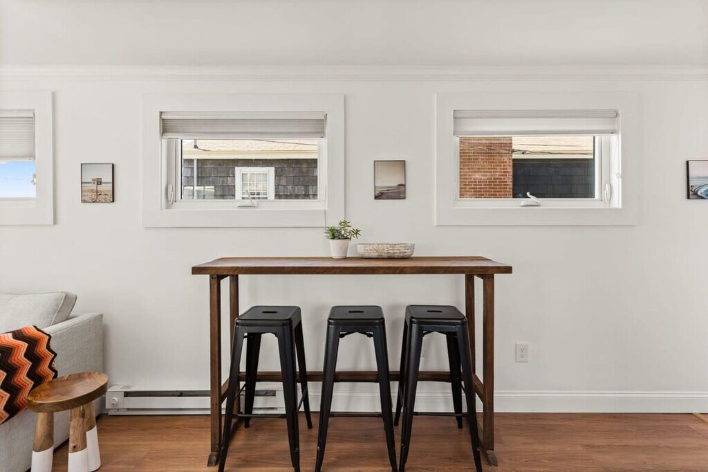 Feel at home in "The Surf", Rye's ultimate private vacation home, located directly across the street from the ocean. This single-level property is the perfect coastal getaway. This home comfortably sleeps four people and features heat and AC, high-speed internet, and an in-unit washer and dryer. The fully equipped kitchen includes all major appliances, a drip coffee maker, and complimentary coffee. Enjoy the sectional couch and Roku smart TV in the living room. The bedroom features a queen bed, clean linens, a sleeper sofa, and a slider door with access to the back deck, backyard, and stairs up to the rooftop deck. The full bathroom has a stand-up shower and fresh towels. Off-street parking is available for up to four cars. Centrally located to Jenness Beach, Wallis Sands State Beach, and Rye Harbor, this home offers lots of backyard fun and a first-level deck with marsh views. Enjoy the private ground-level deck with an outdoor dining table, a spacious backyard, and a rooftop deck with outdoor couches and marsh and ocean views, accessible by a spiral staircase. The property's quiet hours are between 9:00 PM and 9:00 AM. A Ring Doorbell Camera is on the exterior of the property facing the outside of the entrance, which is not monitored but does record. A Minut noise monitor system is located inside the property in the kitchen/living room, which measures volume levels and is 100% privacy compliant. Guests must be at least 25 years old to book. A starter supply of essentials (shampoo, body soap, hand soap, paper towels, and toilet paper), coffee, sugar, and creamer are provided to help you settle in for the first few days of your stay. If you anticipate needing more, please plan to bring additional supplies. Includes a work-from-home desk. Registration Number: 103952 [SI]