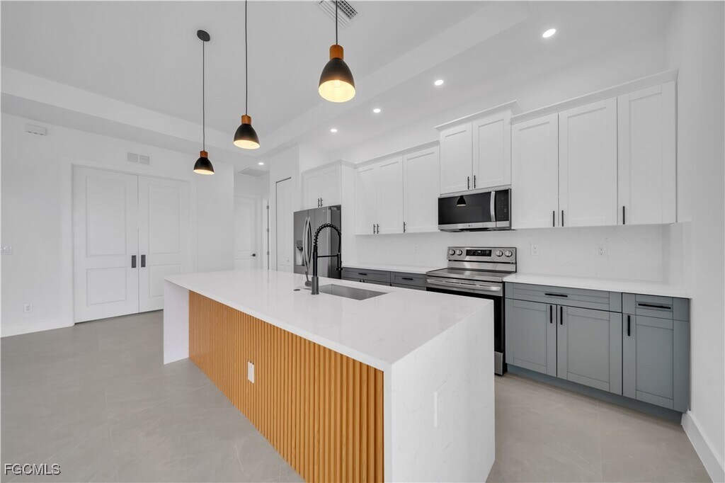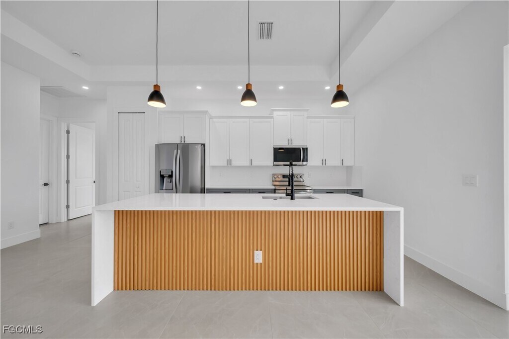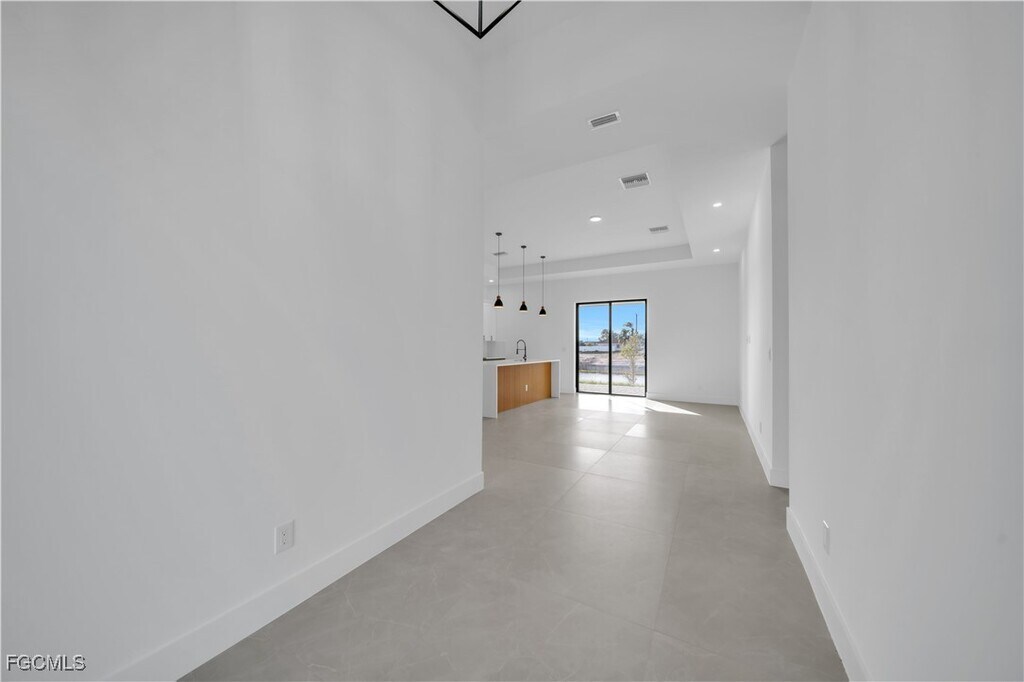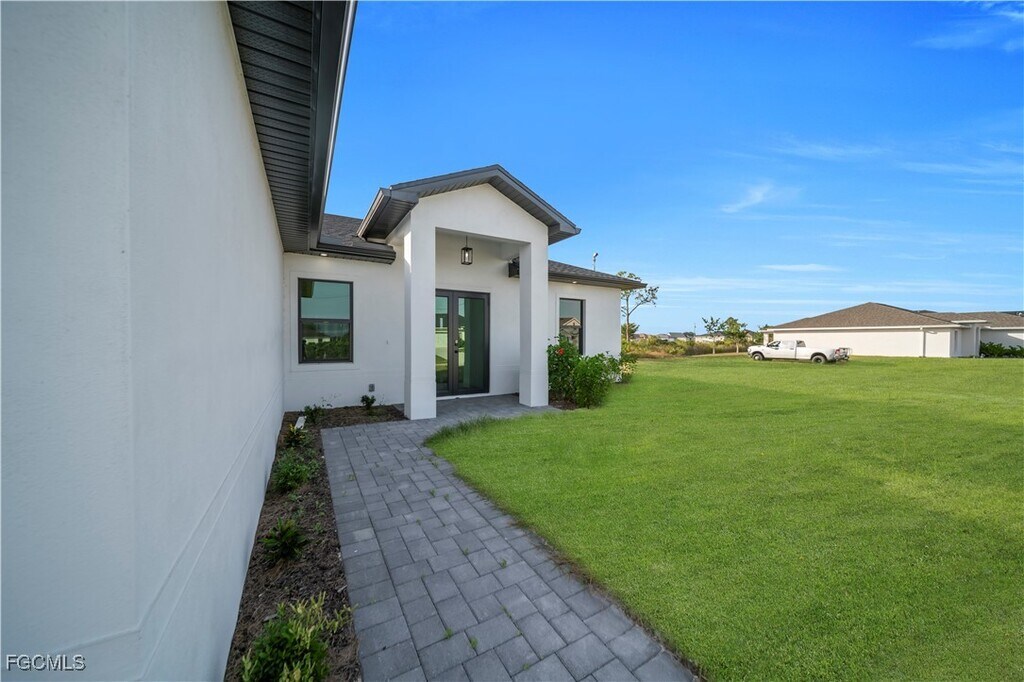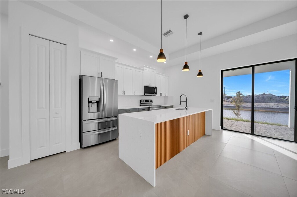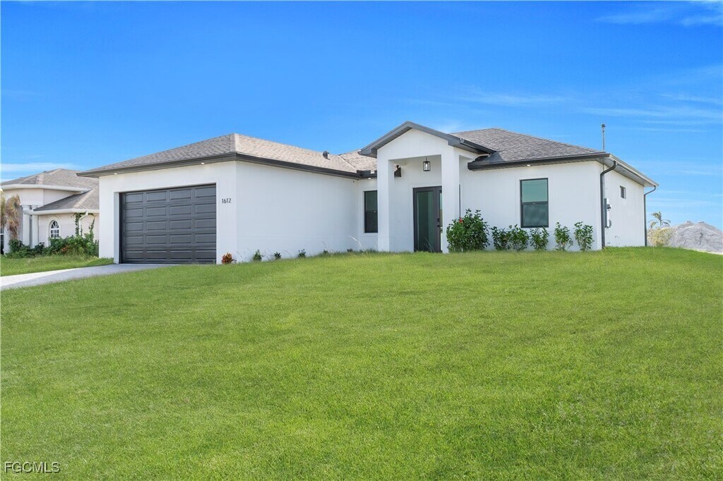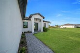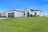 Brand-new construction-move-in ready! Discover this stunning 3-bedroom + den,2-bath home perfectly situated in one of Cape Coral’s most sought-after neighborhoods. Enjoy tranquil freshwater views right from your backyard. The home showcases a modern kitchen with a quartz waterfall island,premium stainless steel appliances,and soaring ceilings that create an open,airy ambiance. Additional highlights include a spacious laundry room with built-in cabinetry and impact-resistant windows and doors for peace of mind. No flood insurance required-experience modern coastal living at its finest in this newly built home ready for immediate occupancy!