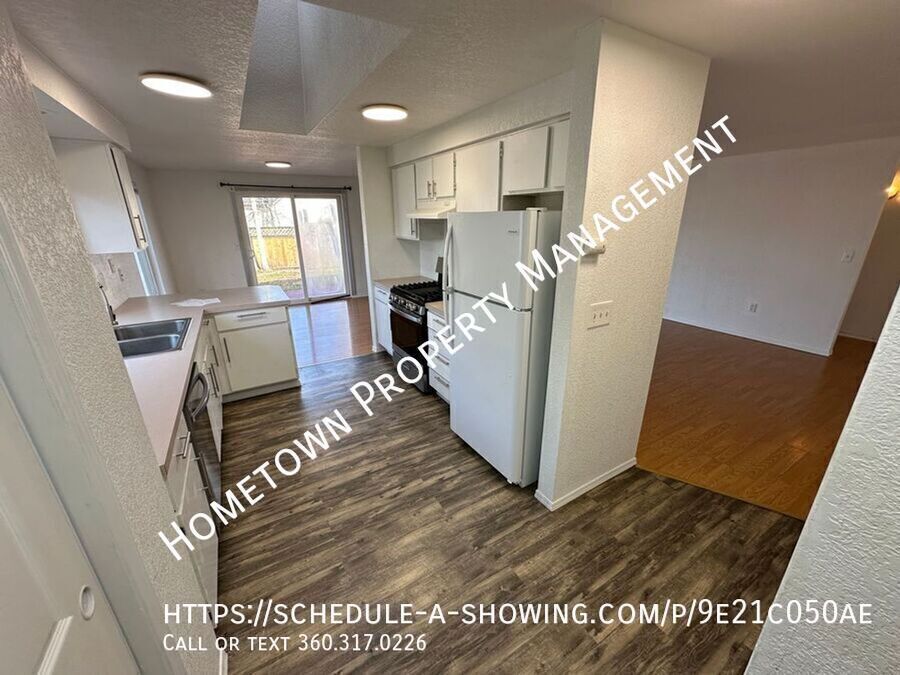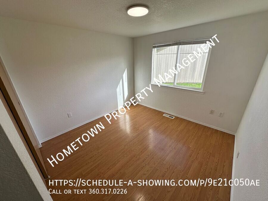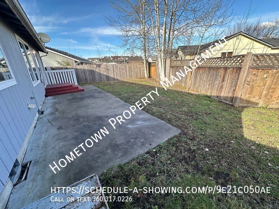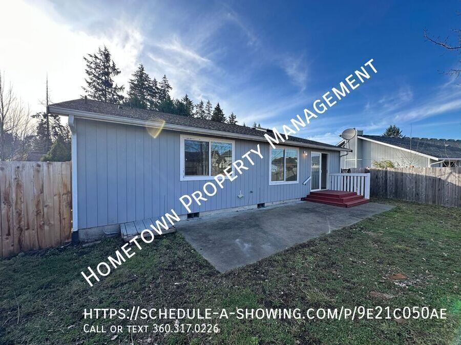 Charming 3-bedroom, 2-bath home in Yelm featuring bright, open living spaces and abundant natural light. Laminate and tile flooring throughout. Kitchen includes gas range/oven, dishwasher, ample cabinet space, and convenient eating bar. Primary suite offers a walk-in closet and private bath with step-in shower. Cozy electric fireplace in the living area. Enjoy a covered front porch and a large, fully fenced backyard with patio, perfect for outdoor living. 2-car garage with opener and laundry area with washer/dryer hookups. ****NO SMOKING**** Pets negotiable with pet rent of $35 per month per pet. 12 month minimum lease. Fabulous Yelm location, close to parks, shopping and area amenities and only a 25 min commute to JBLM. To schedule a showing, click on the following link: