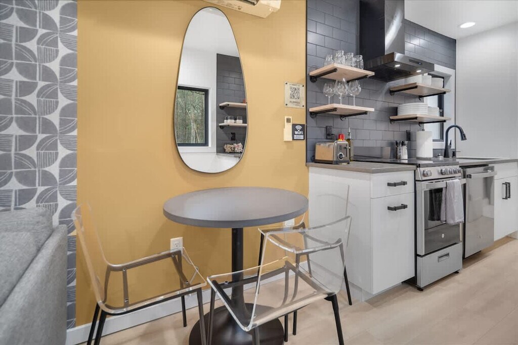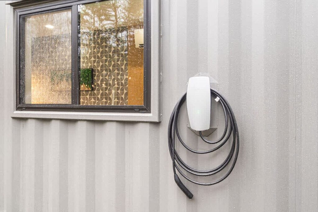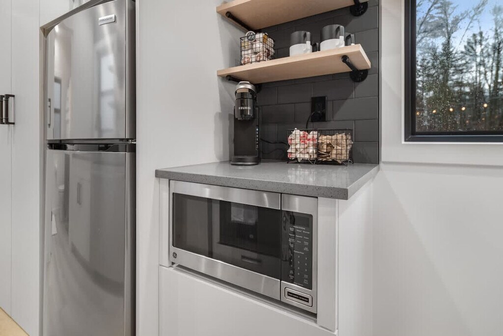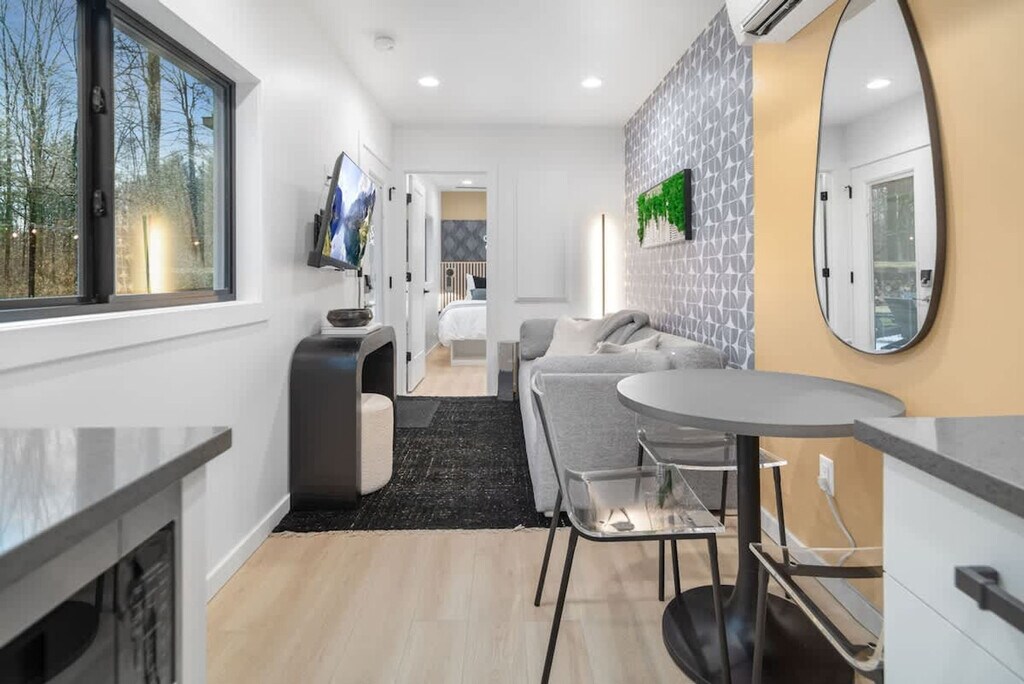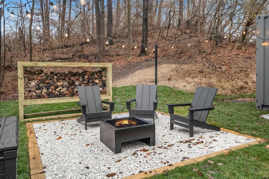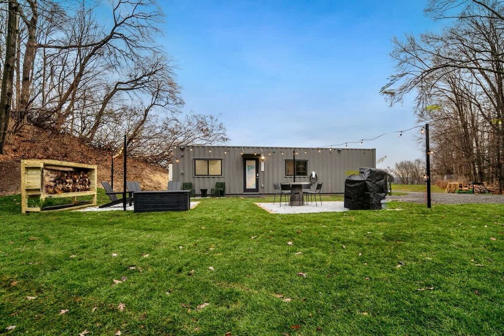 Experience tiny home living without giving up any modern amenities in this shipping container home. Feel at home in this industrial meets rural tiny home. This 40' shipping container was transformed into a luxury tiny home. The full kitchen includes a stove, oven, microwave, fridge/freezer, and dishwasher, as well as a washing machine and dryer. The bathroom has a walk-in shower. The bedroom has a comfortable queen-size bed and blackout shades. The living space has a couch, table for three, and Roku TV. Fast Starlink Wi-Fi covers the home. A Level 2 EV charger is available for your use. Well-behaved dogs are welcome when added to the reservation. The home is located 15 minutes from downtown Ithaca, 17 minutes from Cornell, and 14 minutes from Ithaca College. Outside, enjoy a private yard with a fire pit (firewood and starter included with your stay), hammock, BBQ, and eating area. The 900' driveway is on a hill, and while snow and ice are managed around the clock, a winter-capable vehicle is highly recommended. Quiet hours are between 10:00 PM and 7:00 AM. Cats and other pets are not allowed.