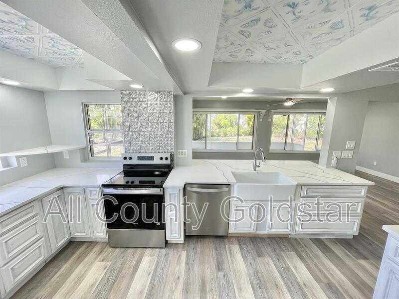 Beautifully renovated 3 bedroom, 1.5 bath home in Port Charlotte featuring a completely updated interior with brand new finishes throughout and tile flooring across the entire home. Enjoy elegantly renovated bathrooms and a thoughtfully designed oversized kitchen with tile-accented ceilings, a farmhouse sink, beautiful stone countertops, and all-new appliances. The home offers both a dedicated living room and separate dining room, providing plenty of space for relaxing and entertaining. A washer and dryer are included for your convenience. Step outside to a spacious yard with mature trees, a screened-in lanai, and an additional outdoor paver deck, perfect for enjoying Florida living. A large side shed is also available for tenant use upon request. Conveniently located just off Edgewater Drive and minutes from downtown Punta Gorda, Sunseeker Resort, and the Edgewater public boat ramp. To schedule a tour or apply now please visit us at