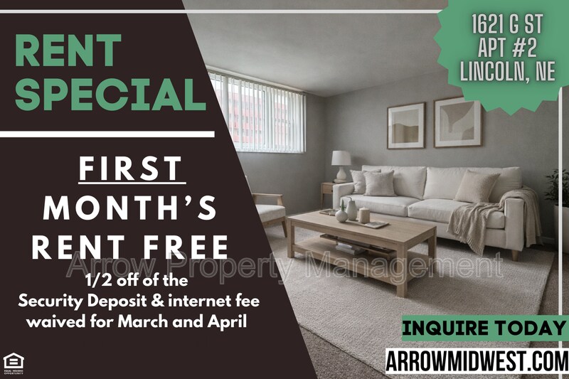 Welcome to 1621 G Apt #2, a charming one-bedroom, one-bathroom apartment located in the heart of Lincoln, NE. This ground floor apartment offers the convenience of off-street parking, ensuring your vehicle is always close by. Inside, you'll find a spacious layout that is both comfortable and functional. The central A/C ensures you stay cool during those hot summer months. Additionally, the shared laundry facilities make laundry day a breeze. With its prime location and thoughtful amenities, 1621 G is the perfect place to call home. visit to apply and schedule a showing. Additional Information- Pets: Negotiable with a $150 non-refundable pet deposit and monthly pet fee. Monthly Fees: CAM Fee: $15/month Shared Utility Fee: $35/month per tenant Internet Fee: $60/month Utilities: Tenant pays for electric and gas; landlord provides water and trash service. All Arrow Property Management residents are enrolled in the Resident Benefits Package (RBP) for $30.00/month which includes liability insurance, credit building to help boost the resident’s credit score with timely rent payments, our best-in-class resident rewards program, and much more! More details upon application. Amenities: off-street parking, ground floor apartment, central a/c
