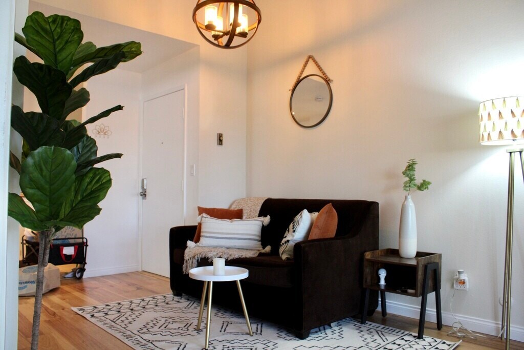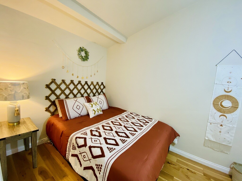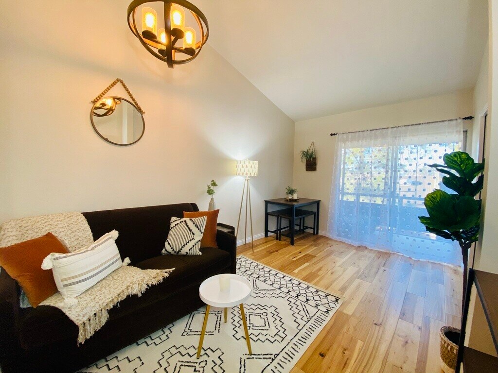 Boho modern onebedroom apartment with a private patio with view of pool and fountains. Bath tub, private bathroom. Kitchen with fridge microwave range. Free Wifi. Sofa bed couch with double mattress. Flat screen TV w Apple TV. Near downtown, beaches, hiking paths. Air conditioning heating. Inquire regarding cleaning service. Peaceful, quiet county atmosphere, urban setting, central to Area Swimming Pool, Hot Tub, BBQs Tennis Basketball court Laundry Center Fitness center moreEscape to our brand new Boho unique 1 bedroom, 1 bath condo. Centrally located in San Diego in a peaceful, hidden community full of amenities including Free WiFi and parking, AC, swimming pool and hot tubDip your toes into the sparkling swimming pool or hot tubSleep soundly in our new super comfy memory foam mattress surrounded by celestial decor.Chill on our soft velvet couch while watching your favorite shows on our 55 Area Amenities Gated Swimming Pool Hot Tub Tennis Basketball Fitness Center Sauna Upgraded Laundry Facility BBQs Club HouseLoungePowered by
