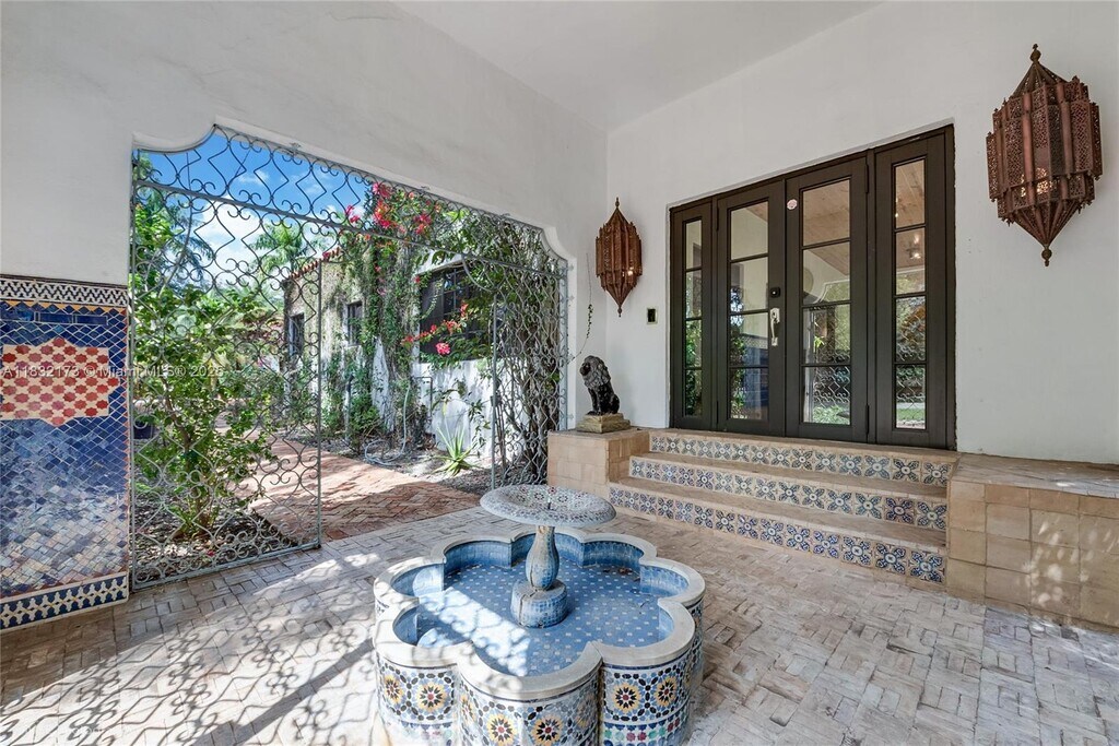 Experience timeless elegance in this stunning Coral Gables Mediterranean Villa, featuring exquisite Moroccan details on a coveted corner 1/2 acre lot. A charming courtyard entry leads to sunroom w/ arched windows & tranquil fountain. The grand living room boasts soaring beamed ceilings, carved fireplace & adjoining formal dining room. Beautifully crafted wood-scroll staircase ascends to the master suite, complete w/ fireplace, rich wood floors & private terrace overlooking the sparkling pool & serene fountain. The enchanting carriage house/guest cottage have impact windows & doors. Lush landscaping, peaceful pond & charming gazebo complete this architectural masterpiece, originally designed by renowned architect Martin Luther Hampton. Walk to Granada Golf Course, tennis & restaurants.