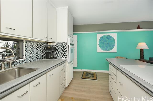 Don't miss this excellently located, immaculate top floor condominium unit in a charming low rise complex convenient to UH/town and half a block from Makiki Park! Well appointed furnishings, new paint and flooring. Enjoy indoor/outdoor living from the impressively large tiled lanai with courtyard, pool and treetop views. Open floor plan boasts a full kitchen and solid surface countertops, & generous bathroom storage includes a shelved linen cabinet. Modern, clean & bright.