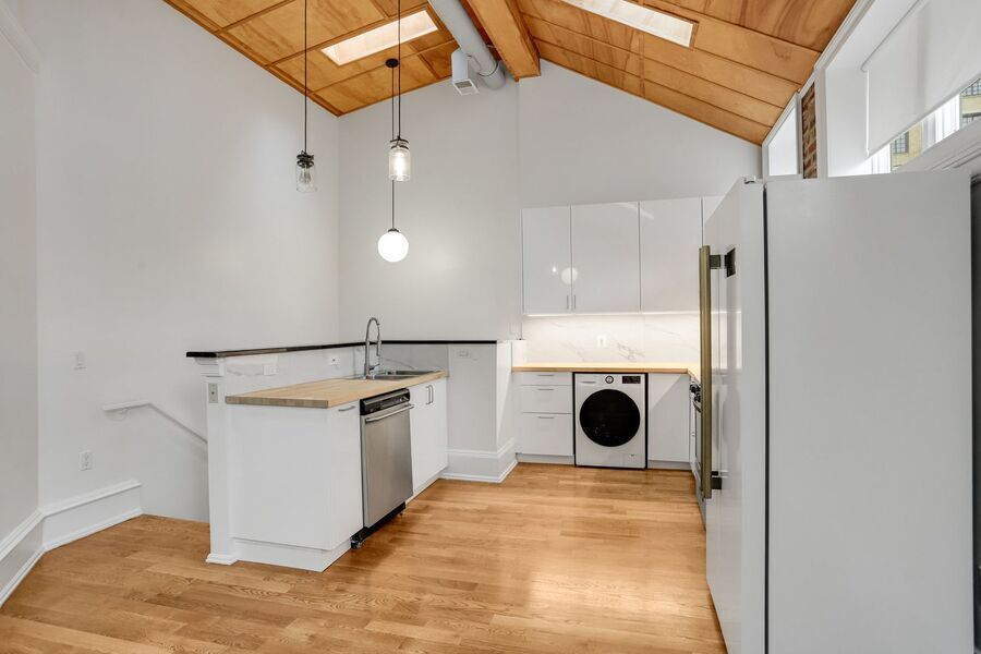 This one-bedroom, one bathroom, two-level carriage house features a renovated kitchen, which is complete with plenty of counter space, white cabinets, and modern appliances ( a new refrigerator, gas stove, microwave, oven, and dishwasher). The bright living room is accented by gleaming hardwood floors, recessed lighting, and gorgeous skylights. The large bedroom does not disappoint with plenty of closet space and natural light. The en-suite full bathroom has lovely tiling throughout and a skylight. The new in-unit washer/dryer rounds out this gem! Located next to two of DC's most coveted neighborhoods, you'll have options galore nestled just between Logan and Dupont Circle. A couple of blocks away, you'll find grocery options like Whole Foods and Trader Joe's. Head to grab coffee at Slipstream or have lunch at Le Diplomate or Agora DC. The dinner and drink options are endless - ChurchKey, Barcelona, and Etto, to name a few! Located near a circulator stop and 10-12 minutes from Dupont Circle (Red) and U Street (Yellow/Green) metro stations, make commuting a breeze! A security deposit equal to one month's rent is due upon signing the lease. The resident is responsible for gas and electricity. Water is included in the monthly rent. Pets are welcome! Street parking only. To schedule a tour, please use the listing for the most accurate and up-to-date availability. For specific questions about this property, you may email leasing@nest- To view all of our available properties, visit us at www.nest- Nest DC happily accepts applicants whose rent is paid either in part or in full via rental housing assistance provided by the District or the federal government. Dryer Gas Stove Oven Roof Washer Water