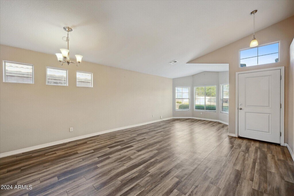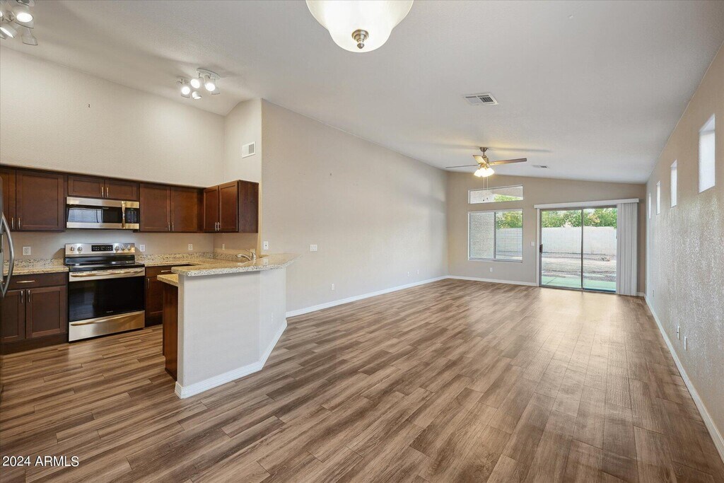 Wonderful 4bed/2bath home in Gilbert's highly sought out Finley Farms Community. This charming home welcomes you with vaulted ceilings,formal dining and living rooms. Lots of windows to let in the natural light. Vinyl flooring in all the common areas for low maintenance cleaning. Enjoy the open kitchen that leads to the family room. Kitchen includes stainless steel appliances,granite countertops and lots of cabinets for storage. The breakfast bar is perfect for hanging with the cook while meals are being prepared. Spacious family room works well for family get togethers and entertaining. Large Primary bedroom with beautiful private bath. His and hers vanities! Enjoy a soak in the tub after a long day. Gilbert schools. Close to shopping,schools,and restaurants. Tour today!
