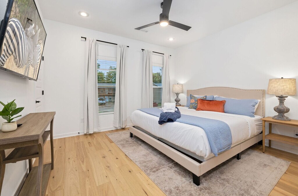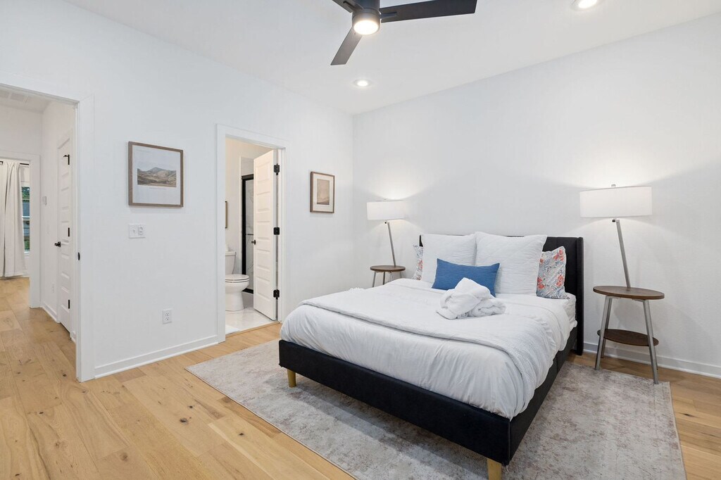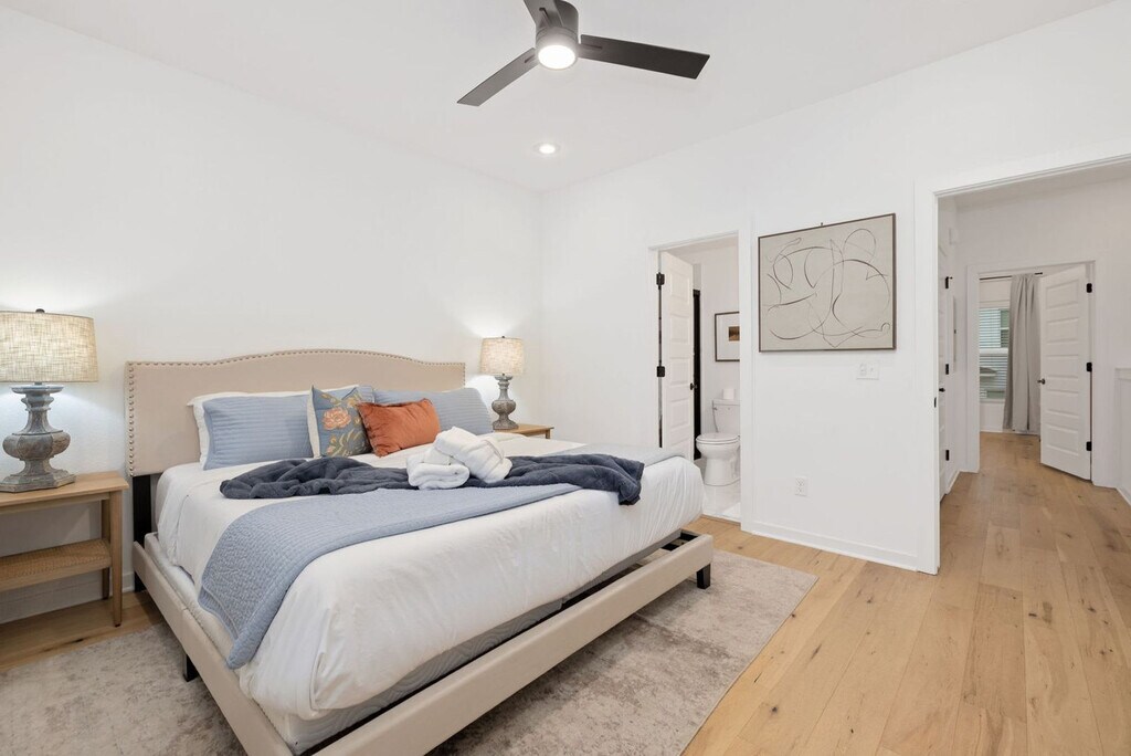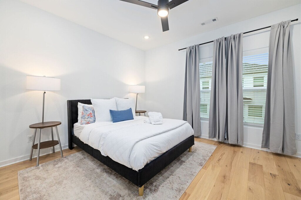 Feel at home in this newly built, modern home at Campus Core, perfect for a 30+ day stay. This 2-bedroom, 2.5-bath home offers luxury amenities and is ideally located for experiencing Fayetteville like a local. The bright, open floor plan features an open-concept living and dining area with plush seating, a large Smart TV, and a dining table for four. The fully stocked kitchen includes new appliances and amenities for creating meals, baked goods, or a great cup of coffee. A washer and dryer are available for guest use. This is a pet-friendly home with a fee of $90 per dog, with a maximum of three dogs allowed. Located near the college campus, this home is 0.5 miles from Bud Walton Arena, 0.8 miles from Baum Walker Stadium, and 1 mile from the University of Arkansas campus and Donald W. Reynolds football stadium. Downtown Fayetteville is just 2 miles away. Enjoy easy access to the Razorback Greenway trail system, with Tsa La Gi Bike Park and the Indian trail only 0.5 miles away. Explore local restaurants, shops, and popular bike trails in Fayetteville. Parties or guest actions that result in disturbances, property damage, extensive extra cleaning, or smoking indoors will incur a fine of $1,000. Dogs discovered at the property without prior notice or cats discovered at the property will incur a fine of $400. Unauthorized checkout delays will incur a fine of $100 per hour. Quiet hours are observed between 10:00 PM and 10:00 AM. [SI]