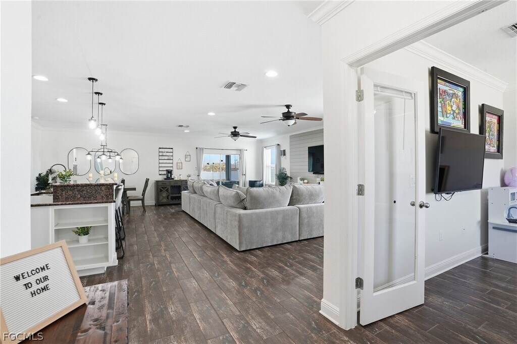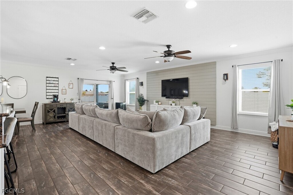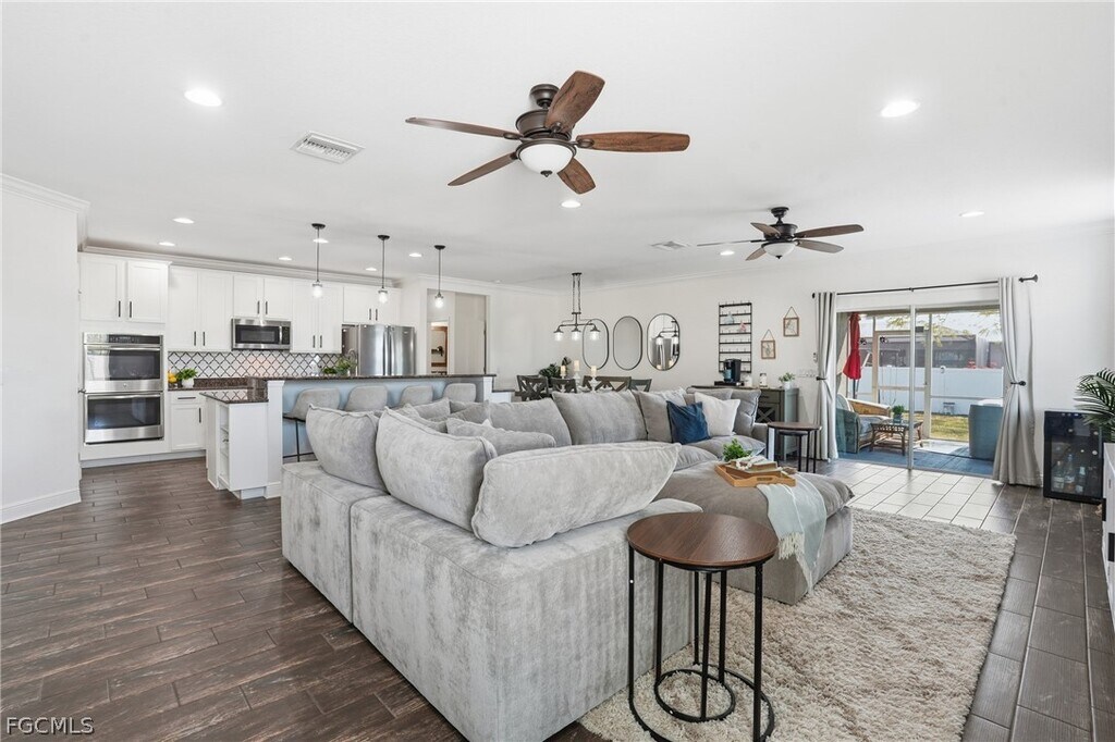 Built in 2017,this well-maintained 3-bedroom plus den,2-bath home offers over 2,000 square feet of open-concept living space in desirable Southwest Cape Coral. The spacious layout features luxury plank tile flooring throughout the main living areas and a bright,open floor plan ideal for both everyday living and entertaining. A large den provides flexible space perfect for a home office,media room,or additional living area. Situated on a corner lot,the property includes a fully fenced backyard for added privacy as well as a 2-car garage. Conveniently located just minutes from restaurants,shopping,and everyday conveniences,and less than two miles from Starbucks,the home also offers easy access to Pine Island Road. The property is located near the future site of The Grove,a planned 131-acre mixed-use development expected to bring residential,retail,dining,and entertainment to the area. Available for rent at $2,100 per month with move-in ready June. Background check and income verification required.