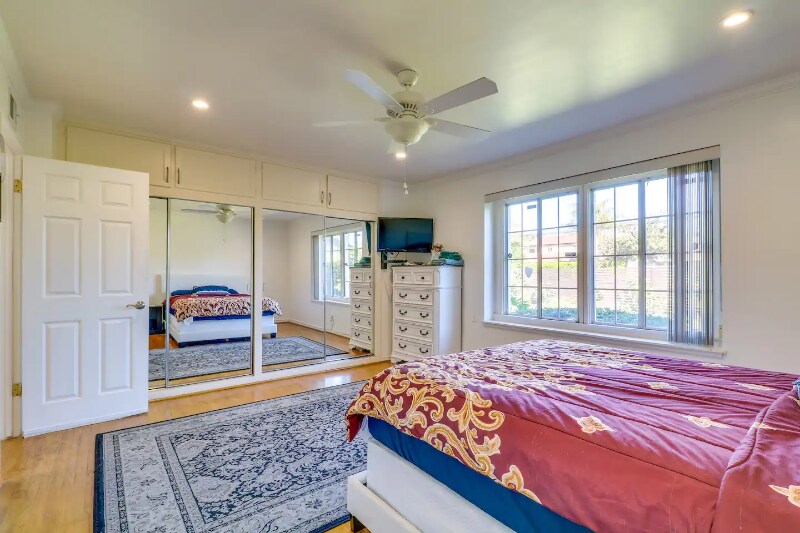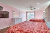 Property Id: 1945673 Fully furnished house with 2 huge bedrooms and 2 luxury bathrooms , living room, dining room , fully equipped kitchen with top stainless steel appliances. Laundry area located in the side yard and shared with other units from the back of the house . 2 queen size beds in each room. Each room has TV . The living room has a 75’ smart TV. Fully furnished patio with living room set and TV with pool view.
