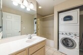 This 2-bedroom residence features a serene living room with high ceilings,a soothing palette,and a harmonious blend of plush carpeting and tile flooring. The well-appointed kitchen comes with granite counters,abundant wood cabinetry,brand new appliances,and a practical pass-through with a breakfast bar. The cozy primary bedroom includes a private bathroom with a stacked washer/dryer and a walk-in closet for added convenience. The paint and carpet are newly redone all throughout the home. The Community boasts a putting green,a refreshing pool,beautiful views,and well maintained common areas. Don't miss out on this fantastic opportunity!