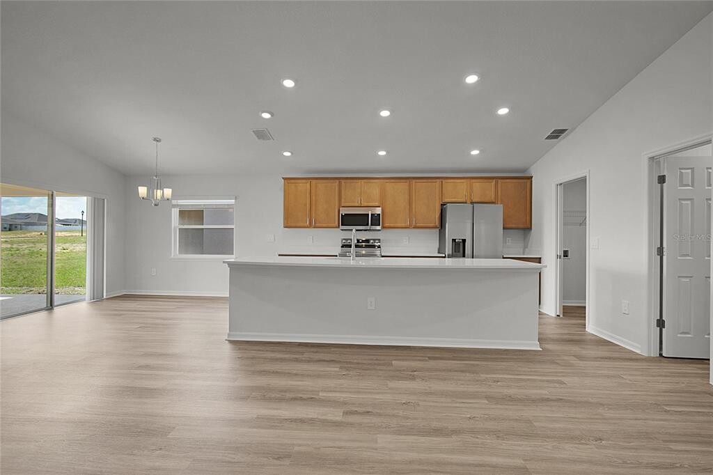 Be the first to live in this brand-new model home in Davenport,FL! This beautiful 4 bedroom,2 bath home features a bright,modern open-concept layout with spacious living and dining areas perfect for everyday living and entertaining. The kitchen is the heart of the home,offering stylish cabinetry,quartz countertops,a large quartz counter-height island,Samsung stainless-steel appliances,and a walk-in pantry. A dedicated laundry room with washer and dryer included adds extra convenience. Enjoy wood-look vinyl plank flooring throughout the main living areas,with carpet in the bedrooms for added comfort. Step outside to your lanai,ideal for relaxing or spending time with family. Residents also enjoy community amenities including a pool and playground. Conveniently located near shopping,schools,dining/food trucks,a hospital,and approximately 30 minutes to major theme parks. Schedule your showing today and don't pass up on this opportunity! MLS# S5145521