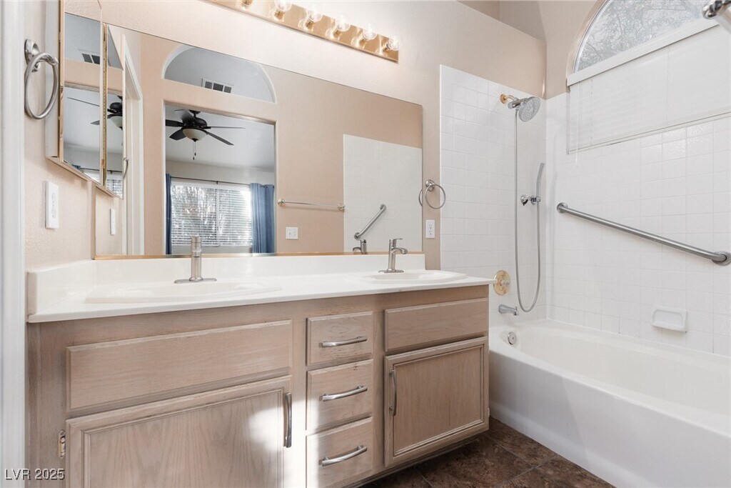 Welcome to this stunning single-story home located in the heart of Summerlin. This property boasts a range of amenities designed to provide a comfortable and luxurious living experience. The home features an inviting fireplace, perfect for cozy evenings, and ceiling fans for those warmer days. The all-tile flooring adds a touch of elegance and is easy to maintain. The covered patio is an ideal spot for outdoor relaxation or entertaining guests. The home also offers a garage with ample storage space, perfect for keeping your belongings organized. Plus, the location provides easy access to Summerlin Parkway, making commuting a breeze. Experience the best of Las Vegas living in this beautiful home. Price includes sewer and trash!