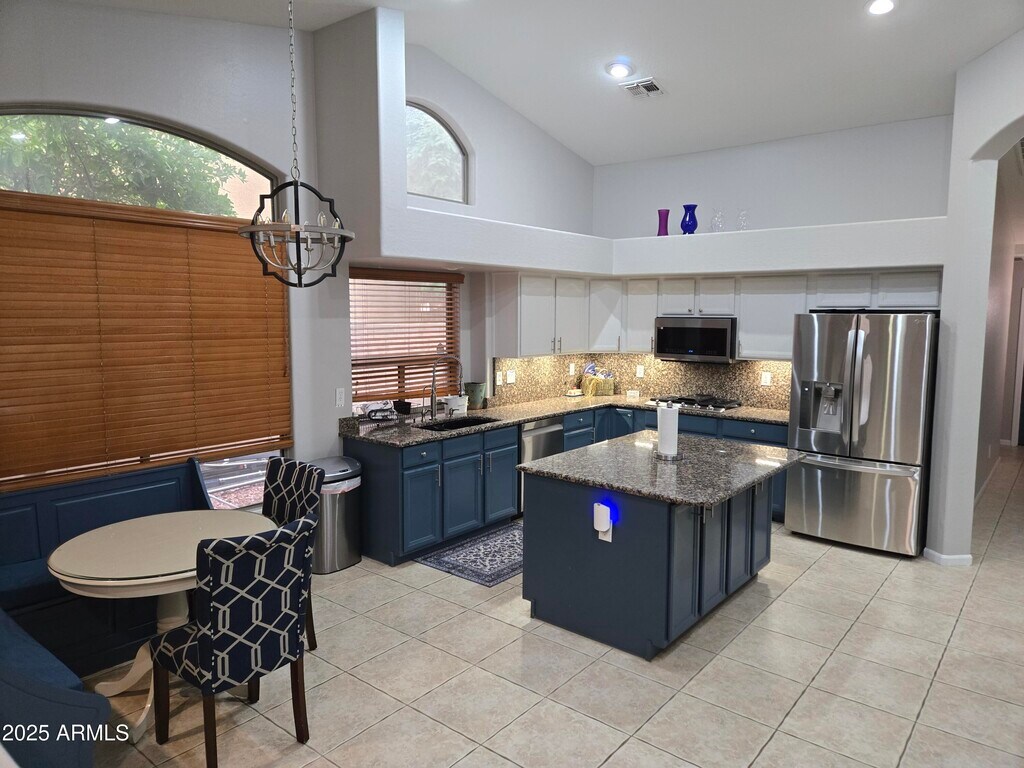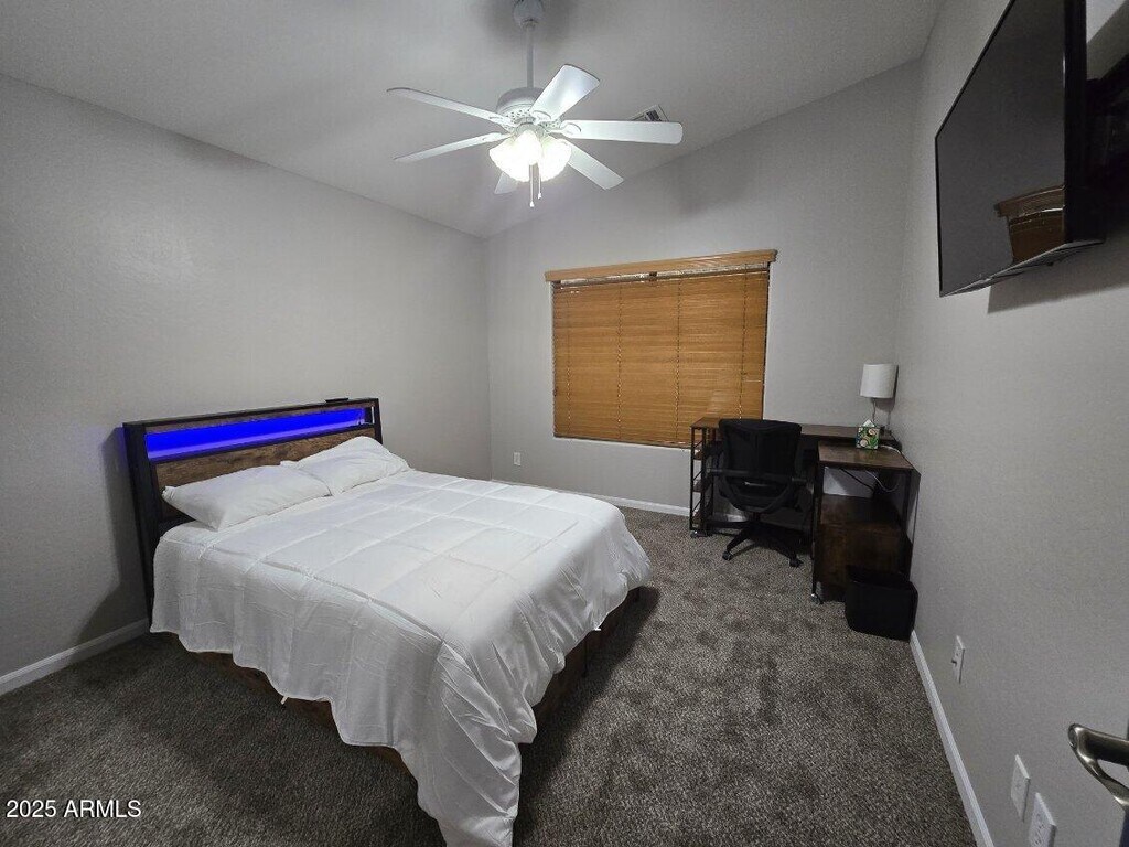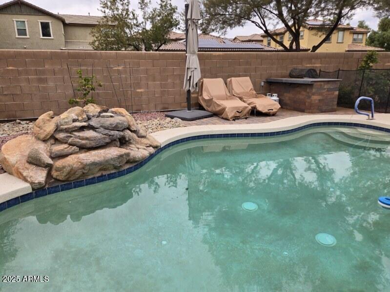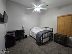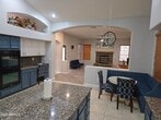 5 bedrooms,2.5 baths & 3 car garage. Gourmet kitchen with double ovens,gas stove,granite countertops,beautiful cabinets,2 huge pantries/storage closets,& large kitchen island. The large primary bedroom suite is complete with double doors,a beautiful walk-in shower with floor to ceiling tile,double sinks,jetted & air soaking tub,and separate exit out to the backyard. Primary suite with queen bed & pull-out twin sleeper. Brand new carpet in all bedrooms,4 bedrooms with full-size beds,1 of them with trundle twin. 2 bedrooms have office space in them and the common area has 3 desk areas. Covered patio,pool with waterfall,and built-in BBQ,lounge chairs,play area and fire pit. Newer A/Cs,brand new roof,and solar,keep the home comfortable.