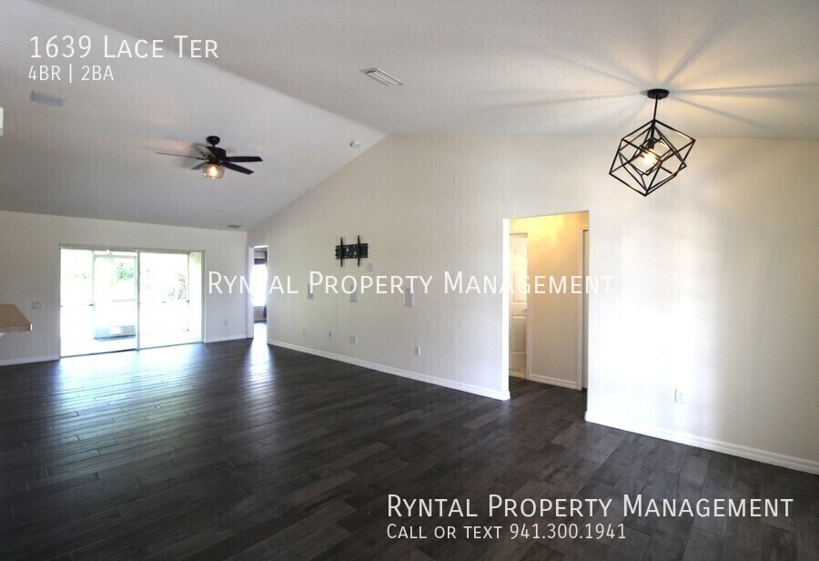 Offering more than 1,800 sq. ft. of living space, this 4-bedroom, 2-bathroom home with 2-car garage is priced exceptionally well. The kitchen provides lots of cabinet and counter space, a pantry, a breakfast bar, and a stainless-steel appliance package that includes a refrigerator, microwave, range, and dishwasher. Complete with two dining spaces, you will find an open concept dining space on one side of the kitchen, and banquette seating on the other, perfect for a small breakfast nook. Details to this home include large windows, vaulted ceilings, unique lighting fixtures, an accent wall, and ceramic tile flooring throughout. The primary bedroom is complete with a roomy walk-in closet, outdoor access to the lanai, and an en suite bathroom featuring dual vanities and a waterfall shower system. Three additional bedrooms and a roomy bathroom complete the interior of this home. Outdoors you will find a private large lanai area to relax in. Attached 2-stall garage which includes an extended work bench The laundry room is located near the garage and includes a full size washer and dryer and utility sink. Pets considered, but no dangerous breeds. Great location in Charlotte County; nearby Myakka State Forest, campgrounds, and the Myakka River. Apply within 24 hours of your conducted showing and once approved you will be credited your application fees towards your first full month's rent! Ryntal Property Management has partnered with Obligo to offer a security deposit alternative to qualified renters! Submit all applications to Ryntal Property Management ONLY! Qualifications: We run a complete background check that includes credit, criminal, income verification, prior landlord and eviction history. In terms of credit, we look at the entire picture as opposed to just the credit score, but in general, we do require a score over 550. Please call for more information. This property is professionally managed by Ryntal, LLC Are you a Property Owner looking for Management Services? We can help!! We are a leader in Sarasota, Manatee, Pasco, Hillsborough, and Charlotte Counties in Residential and small commercial property management services. For more info, please call Custom Tilework Dual Sinks Flat Top Stove Mature/Tropical Landscaping Screened Lanai Solid Surface Countertops